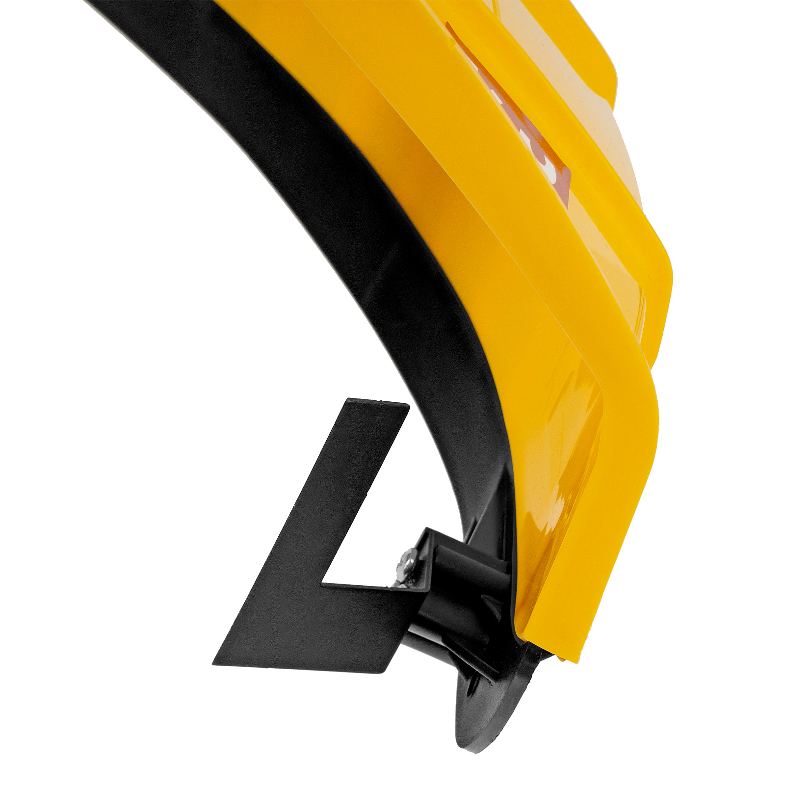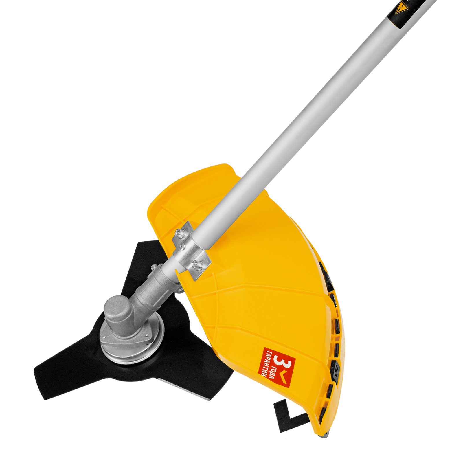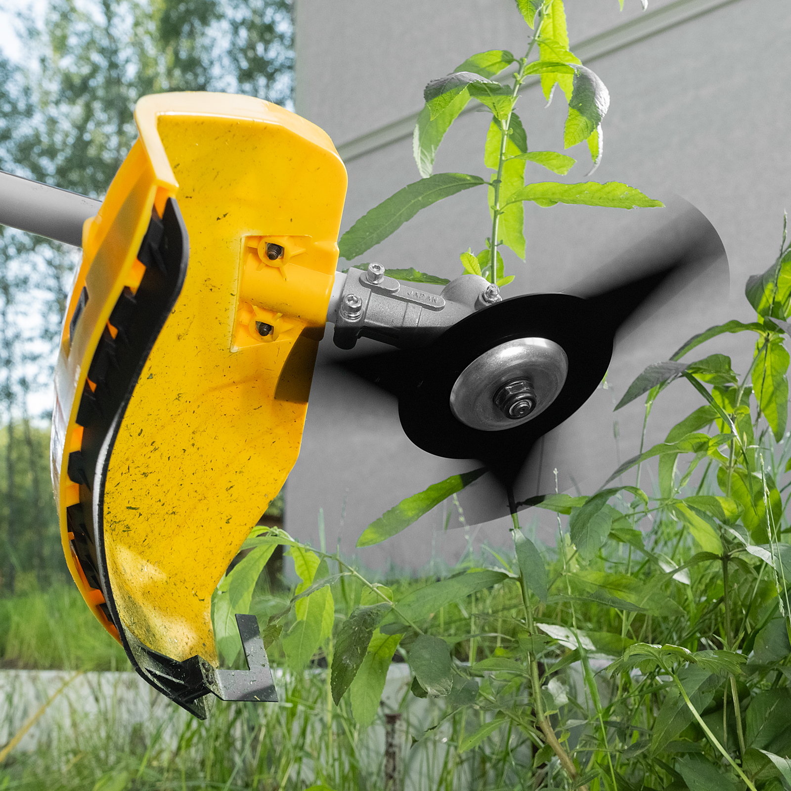 Безопасность — блокировка выключателя препятствует случайному запуску, а защитный кожух предохраняет от летящей травы.