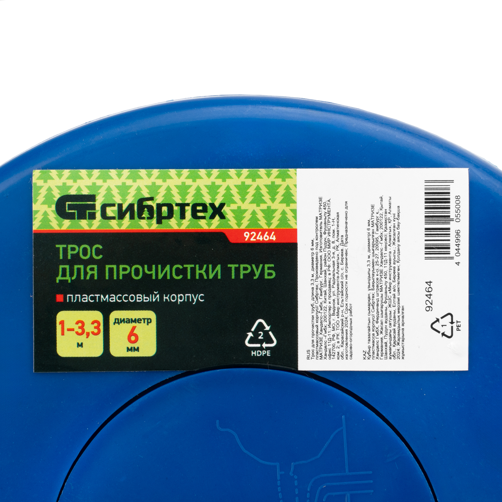 <p>Трос для прочистки труб Сибртех 92464 длиной 3,3 м и диаметром 6 мм, в пластмассовом корпусе, избавит от засоров в канализационных трубах, удалив пробки из волос, шерсти, грязи и жировых отложений. Изготовлен из прочной пружинной стали, поэтому обладает высокой гибкостью и легко преодолевает изгибы трубопровода. Оптимален для бытового использования.</p><h2>Преимущества</h2><ul><li>Продуманная конструкция — корпус с рукояткой для вращения обеспечивает равномерную подачу троса и упрощает процесс прочистки трубы.</li><li>Быстрое продвижение — трос с сердечником устойчив к перекручиванию.</li><li>Эффективность — на конце троса имеется спираль для захвата мусора.</li><li>Эргономичность — рукоятка пистолетного типа удобно ложится в руку.</li></ul>