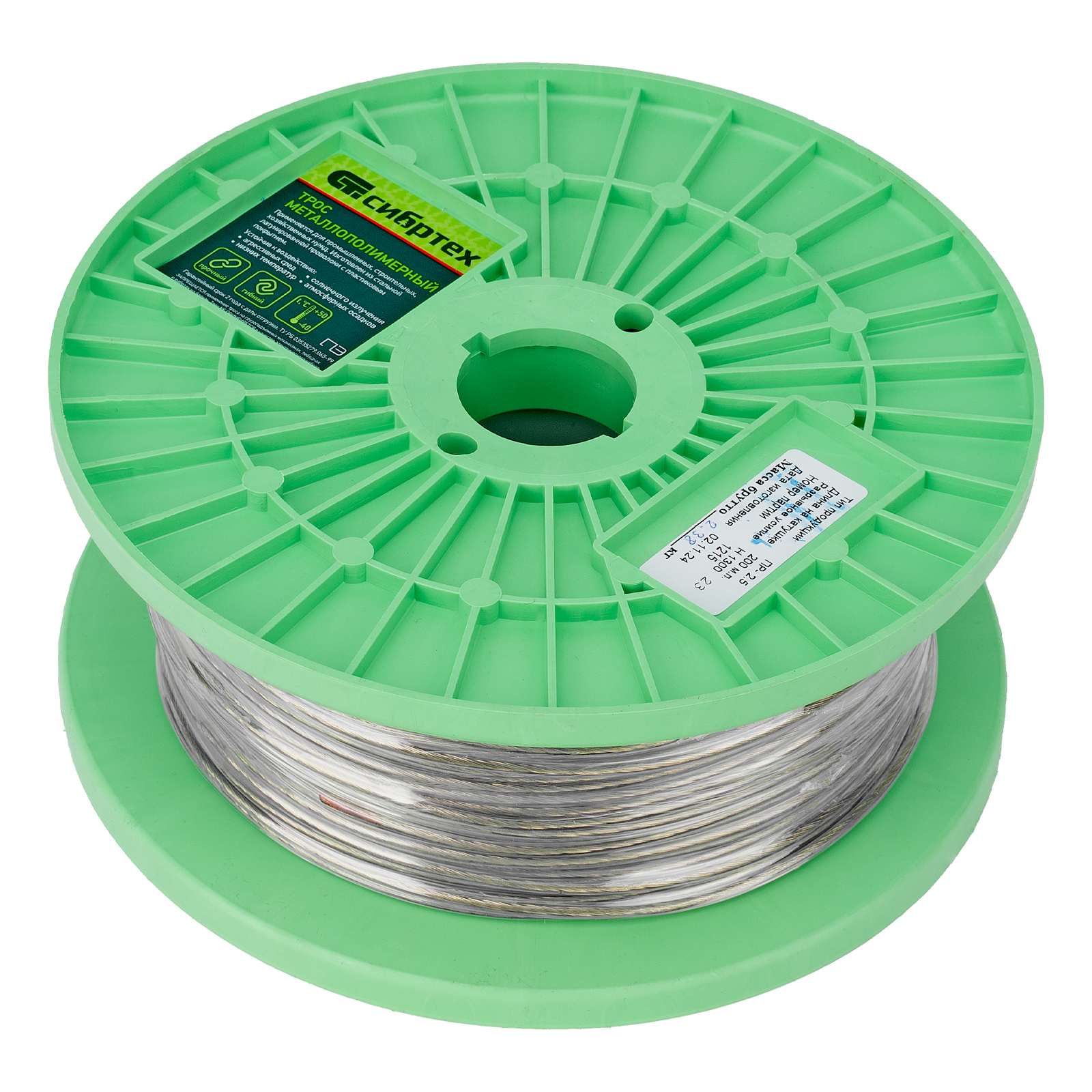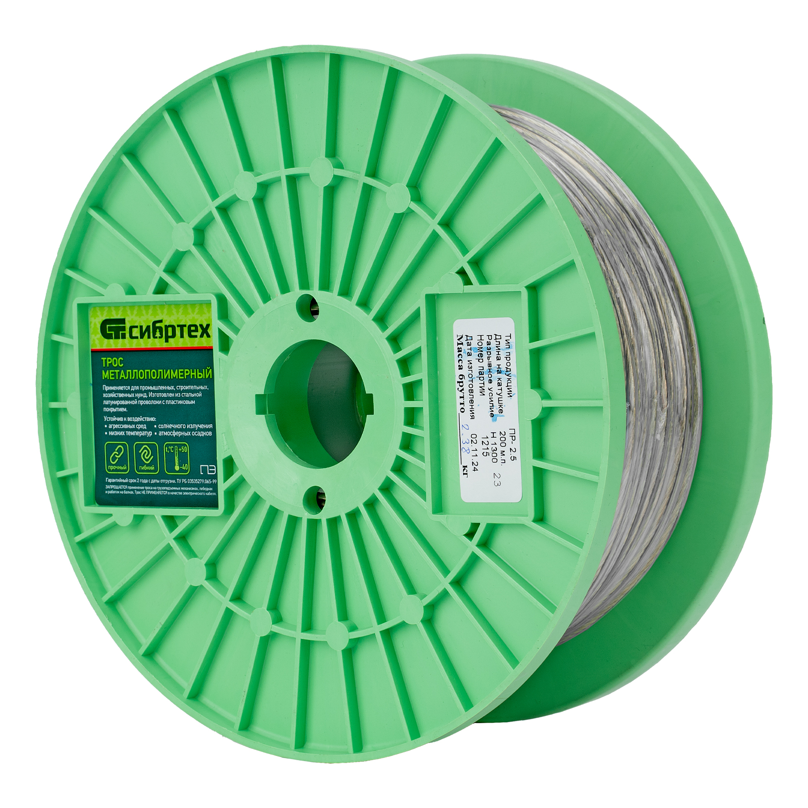 <p>Металлополимерный прозрачный трос ПР-2.5 Сибртех 47626 толщиной 2,5 мм, 200 м. п. на катушке, используется для монтажа рекламных баннеров, установки ограждений, палаток, теплиц, погружения скважинных насосов и датчиков. Применяется в качестве садового троса-шнура для подвязки растений, а также может служить для развешивания белья. Жила шнура изготовлена из стальной проволоки, поэтому он выдерживает значительные нагрузки.</p><h2>Преимущества</h2><ul><li>Долговечность — латунированный сердечник устойчив к коррозии, покрытие из пластифицированного ПВХ защищает изделие от истирания.</li><li>Ровное сплошное покрытие — ПВХ-оплетка нанесена методом экструзии.</li><li>200 м в намотке — троса хватит для выполнения большого объема работ.</li></ul>