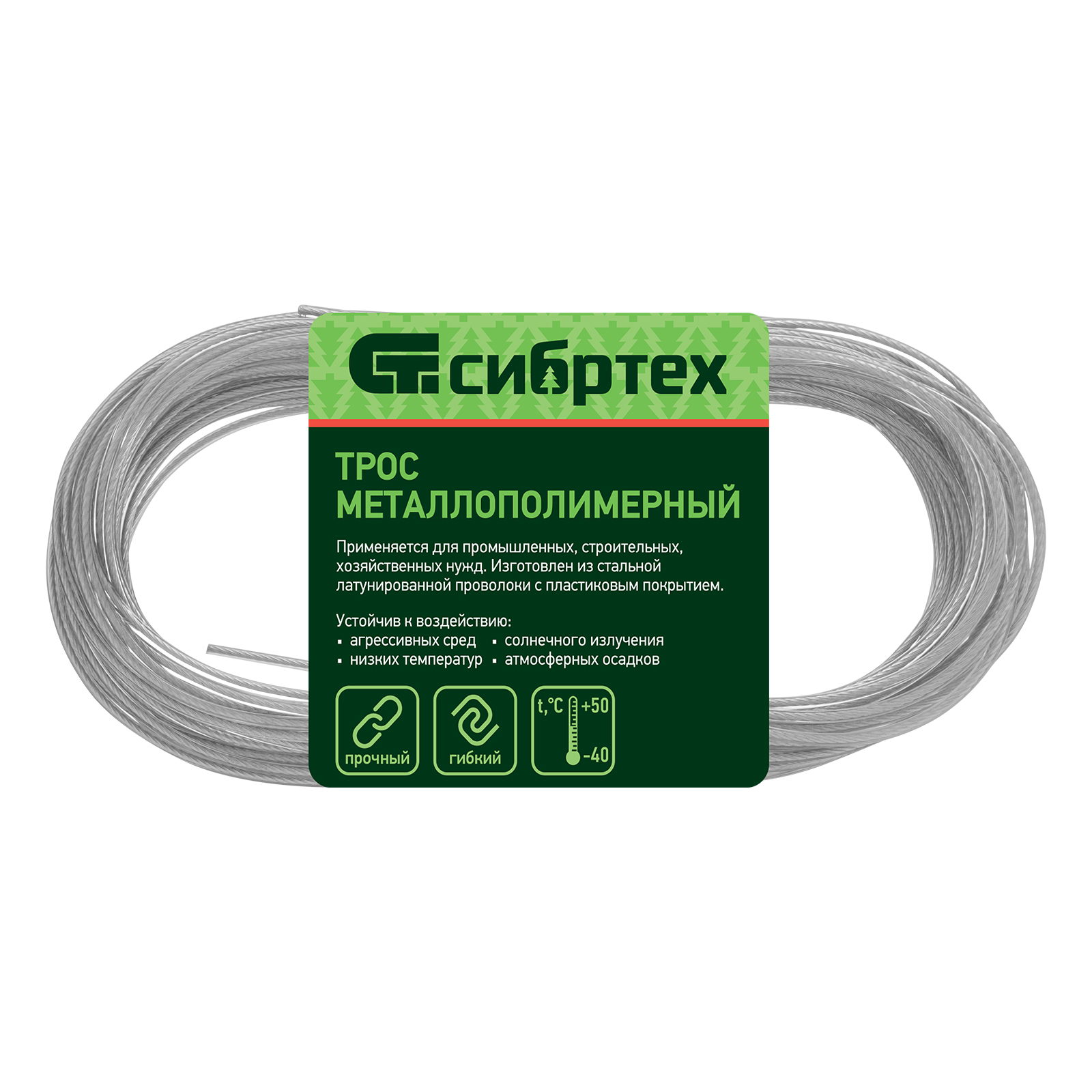 <p>Металлополимерный прозрачный трос ПР-2.5 Сибртех 47627 толщиной 2,5 мм, 20 м. п. в мотке, можно использовать в домашнем хозяйстве для развешивания белья или на загородном участке в качестве садового шнура для подвязки растений. Применяется также для крепления погружных насосов и датчиков, монтажа тентовых конструкций, информационных табличек и растяжек, установки ограждений, антенн и мачт. Трос устойчив к перепадам температуры и воздействиям агрессивных сред, поэтому может использоваться в сложных условиях.</p><h2>Преимущества</h2><ul><li>Устойчивость к разрывным нагрузкам и коррозии — жила троса изготовлена из латунированной стальной проволоки.</li><li>Дополнительная защита от окисления — трос покрыт пластифицированным поливинилхлоридом.</li><li>Целостность покрытия — ПВХ-оболочка нанесена на прозрачный трос методом экструзии.</li></ul>