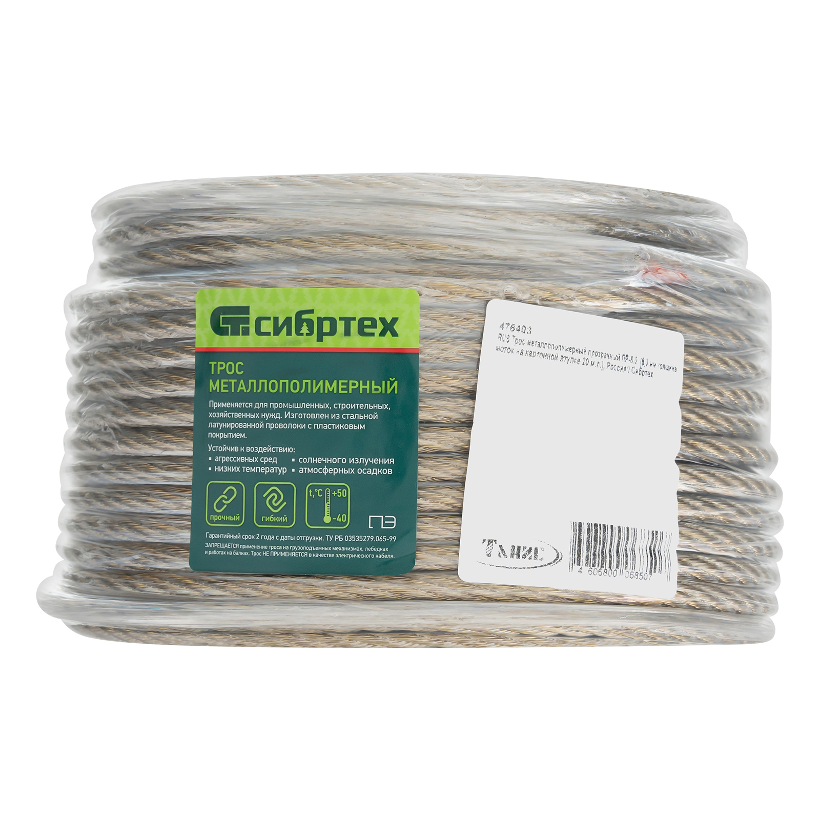 <p>Металлополимерный прозрачный трос ПР-6.0 Сибртех 476403 толщиной 6 мм, 20 м. п. в мотке, можно использовать в домашнем хозяйстве для развешивания белья или на загородном участке в качестве садового шнура для подвязки растений. Применяется также для крепления погружных насосов и датчиков, монтажа тентовых конструкций, информационных табличек и растяжек, установки ограждений, антенн и мачт. Трос устойчив к перепадам температуры и воздействиям агрессивных сред, поэтому может использоваться в сложных условиях.</p><h2>Преимущества</h2><ul><li>Устойчивость к разрывным нагрузкам и коррозии — жила троса изготовлена из латунированной стальной проволоки.</li><li>Дополнительная защита от окисления — трос покрыт пластифицированным поливинилхлоридом.</li><li>Целостность покрытия — ПВХ-оболочка нанесена на прозрачный трос методом экструзии.</li></ul>