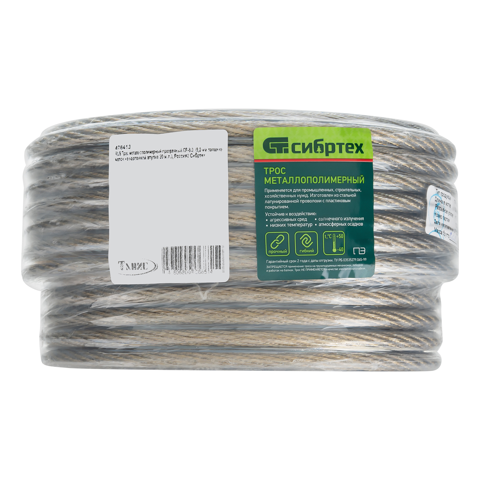 <p>Металлополимерный прозрачный трос ПР-8.0 Сибртех 476413 толщиной 8 мм, 20 м. п. в мотке, можно использовать в домашнем хозяйстве для развешивания белья или на загородном участке в качестве садового шнура для подвязки растений. Применяется также для крепления погружных насосов и датчиков, монтажа тентовых конструкций, информационных табличек и растяжек, установки ограждений, антенн и мачт. Трос устойчив к перепадам температуры и воздействиям агрессивных сред, поэтому может использоваться в сложных условиях.</p><h2>Преимущества</h2><ul><li>Устойчивость к разрывным нагрузкам и коррозии — жила троса изготовлена из латунированной стальной проволоки.</li><li>Дополнительная защита от окисления — трос покрыт пластифицированным поливинилхлоридом.</li><li>Целостность покрытия — ПВХ-оболочка нанесена на прозрачный трос методом экструзии.</li></ul>