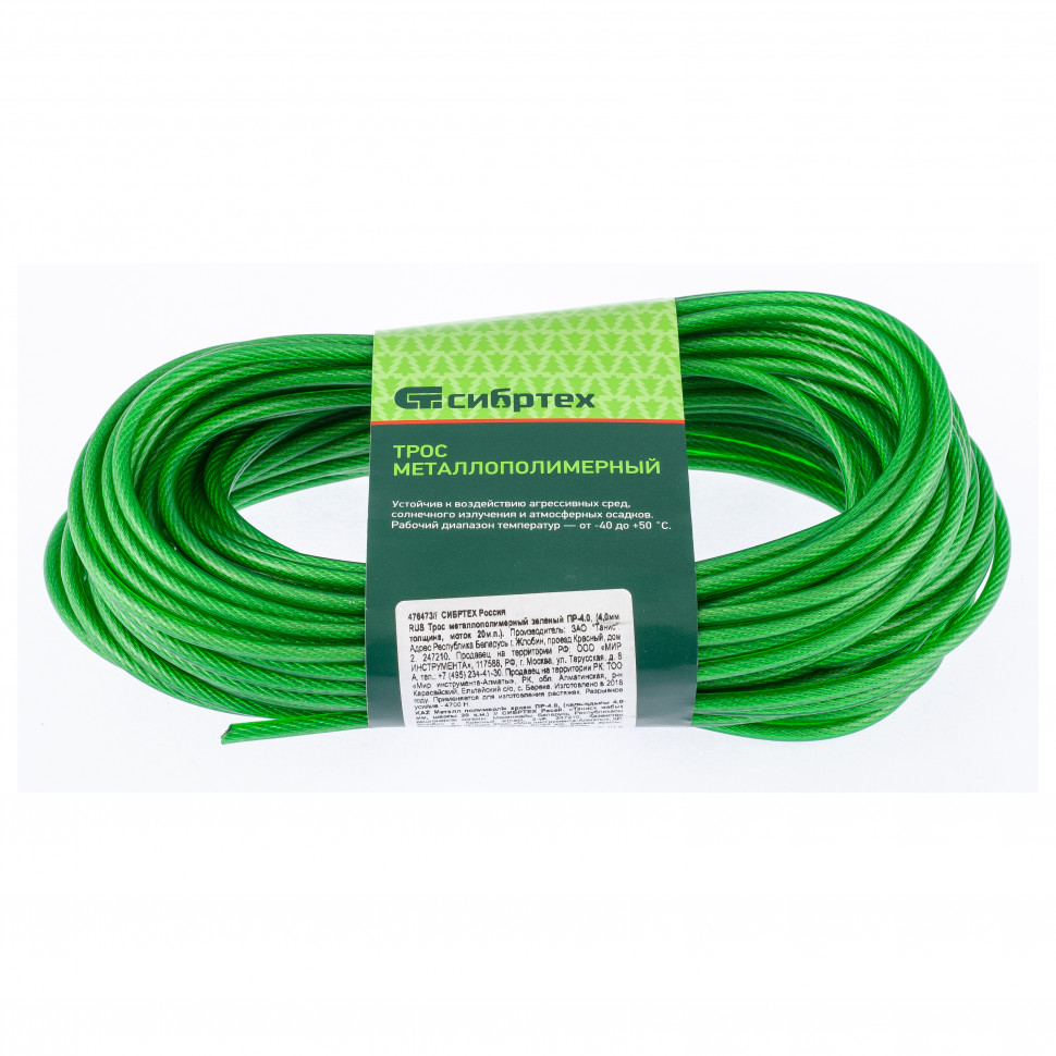 <p>Металлополимерный трос ПР-4.0 Сибртех 476473 зеленого цвета, толщиной 4 мм, в мотке 20 метров, используется для монтажа баннеров и рекламных растяжек, погружения скважинных насосов и датчиков, установки тентов и теплиц, а также в качестве пломбировочного троса. Может выполнять функцию садового шнура для подвязки растений, устройства ограждений, а также применяться в качестве троса для развешивания белья. Благодаря покрытию из пластиката ПВХ-трос устойчив к истиранию, коррозии, УФ-излучению и перепадам температуры, что увеличивает срок его службы.</p><h2>Преимущества</h2><ul><li>Устойчивость к разрывным нагрузкам — жила троса изготовлена из стальной латунированной проволоки.</li><li>Повышенная износостойкость — ПВХ-покрытие нанесено методом экструзии.</li><li>Возможность использования в декоративных целях — оболочка троса выкрашена в зеленый цвет.</li></ul>