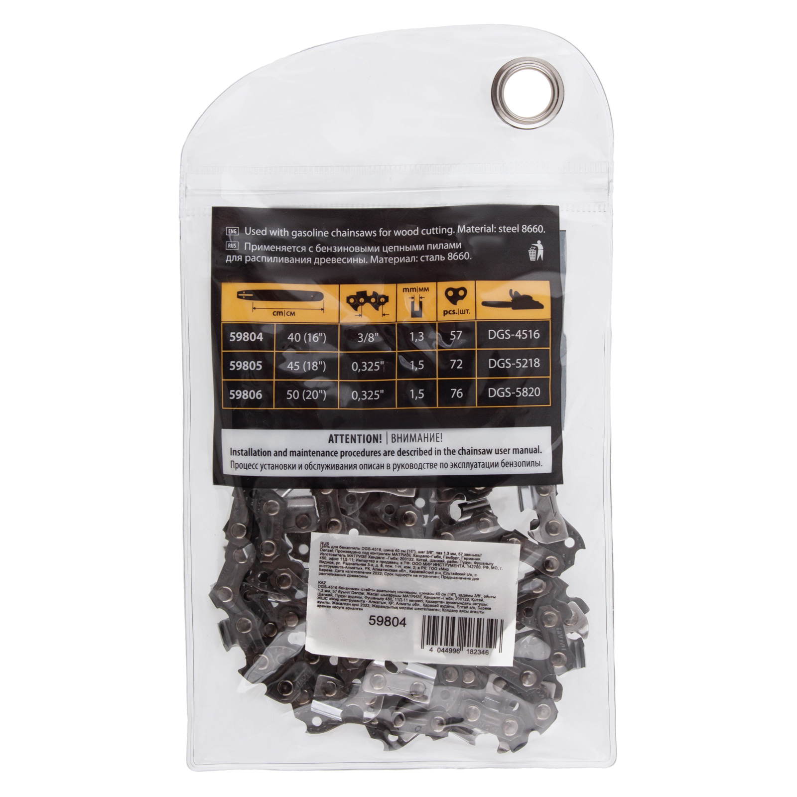 Цепь Denzel 59804 рассчитана на применение с бензопилой Denzel DGS-4516. Состоит из 57 звеньев, надевается на пильную шину длиной 40 см, поэтому отлично подходит для обработки деревянных заготовок в частных мастерских, распиловки бревен, срезания сучьев и веток в саду, также пригодится на охоте и рыбалке.