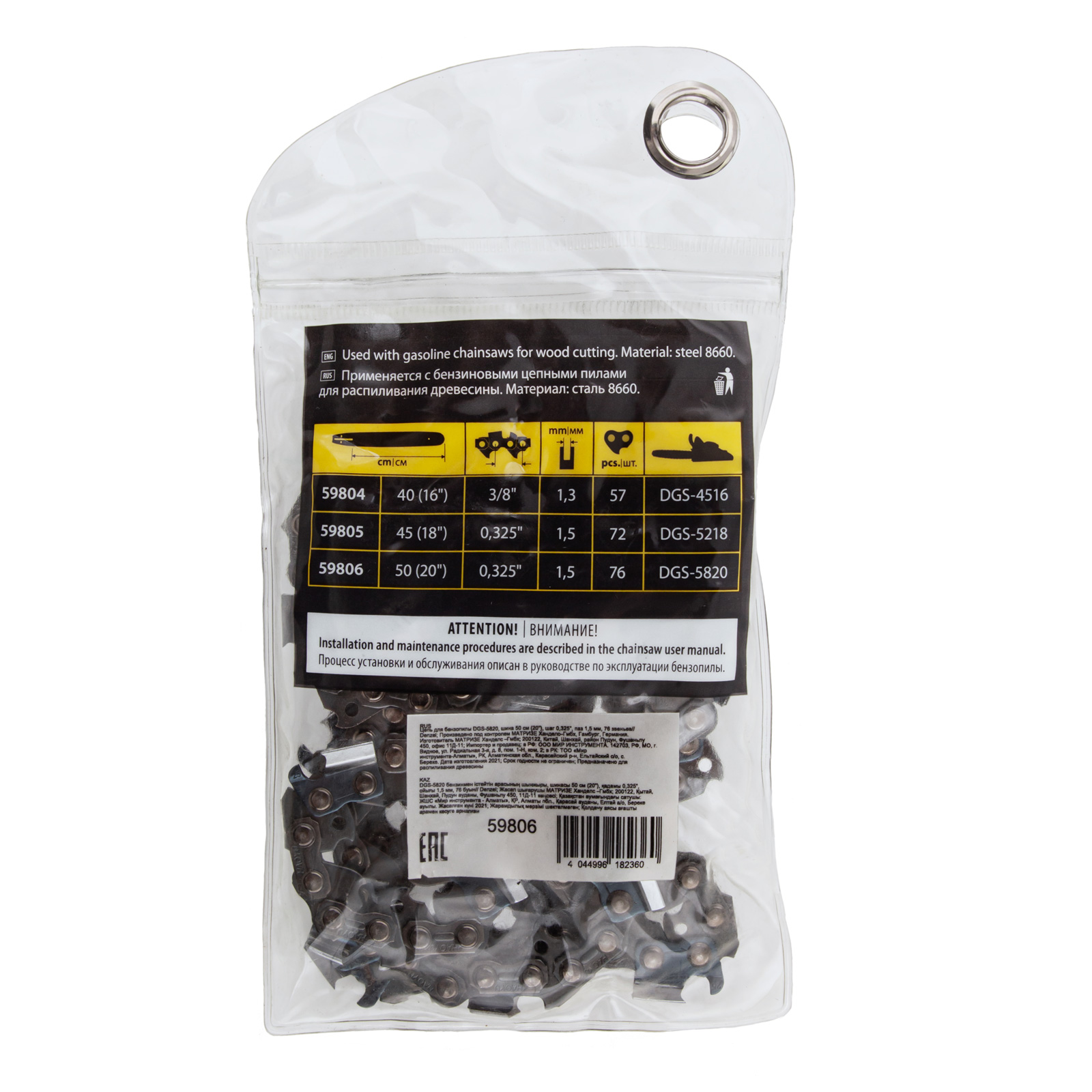 - Безопасное хранение и транспортировка — защитная упаковка предотвращает контакт с острыми звеньями.