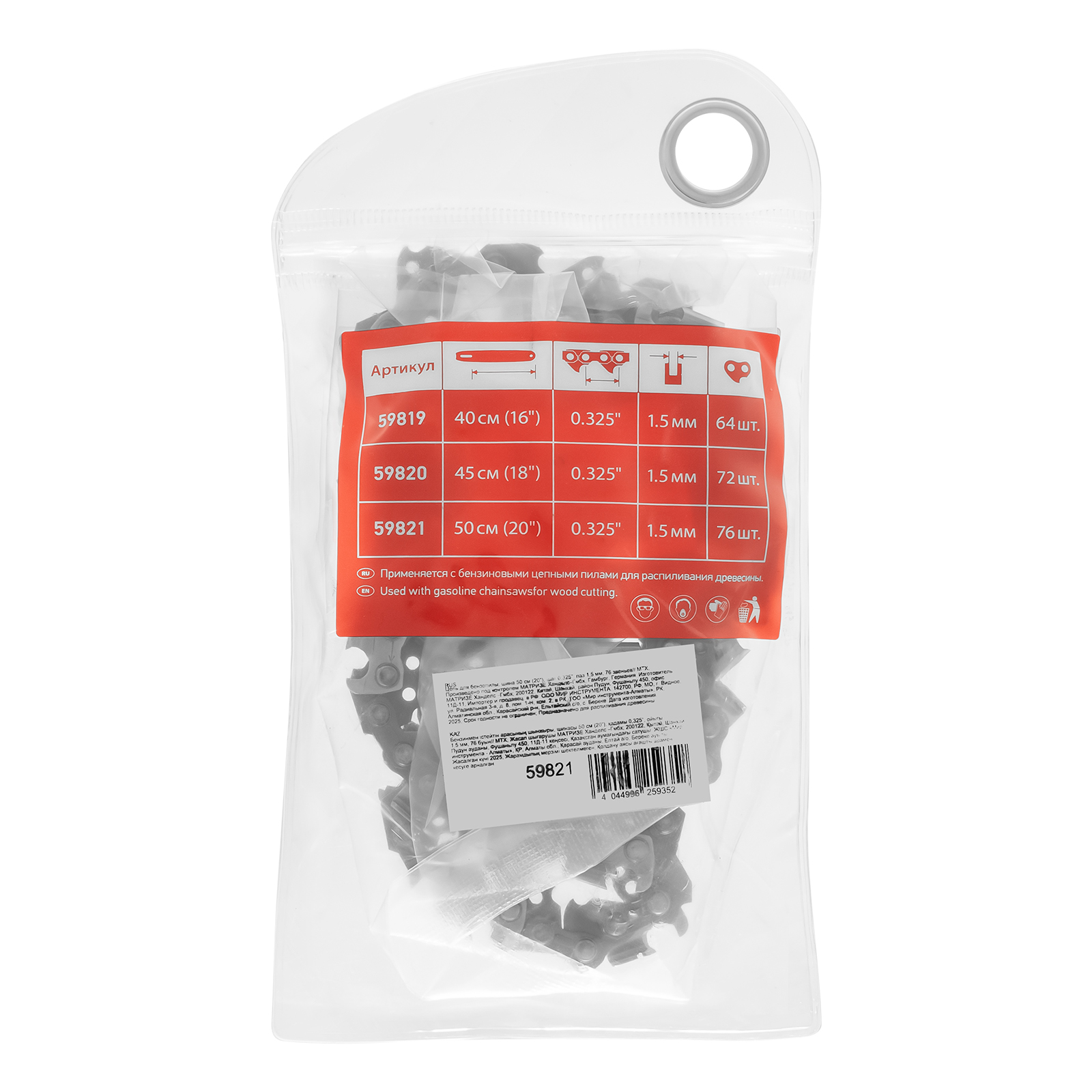 Цепь для бензопилы MTX 59821 с шириной паза 1,5 мм состоит из 76 звеньев с шагом 0,325″ и надевается на пильную шину длиной 50 см (20″). Оптимальна для применения в быту, на строительной площадке и на выездных работах.