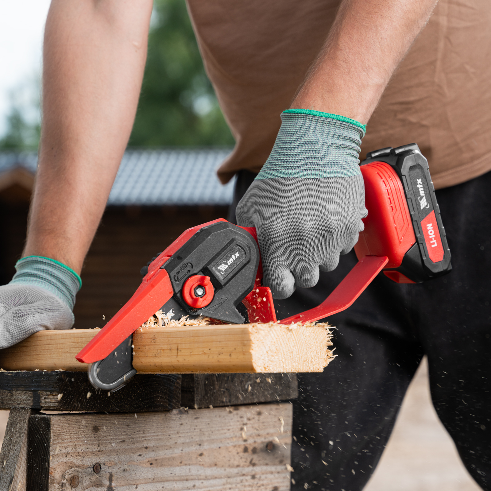 - Работа без ощущения усталости — вес пилы с аккумулятором составляет всего 1 кг, поэтому ее удобно держать в руках.