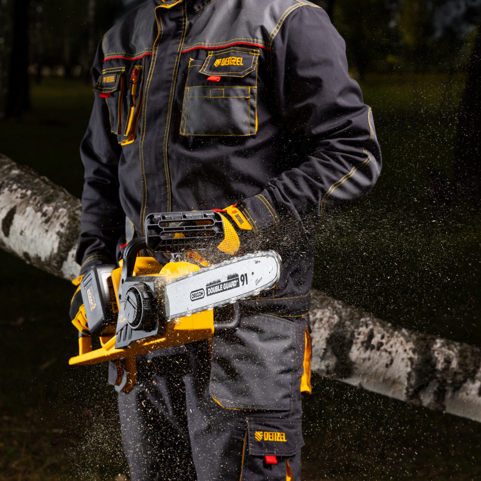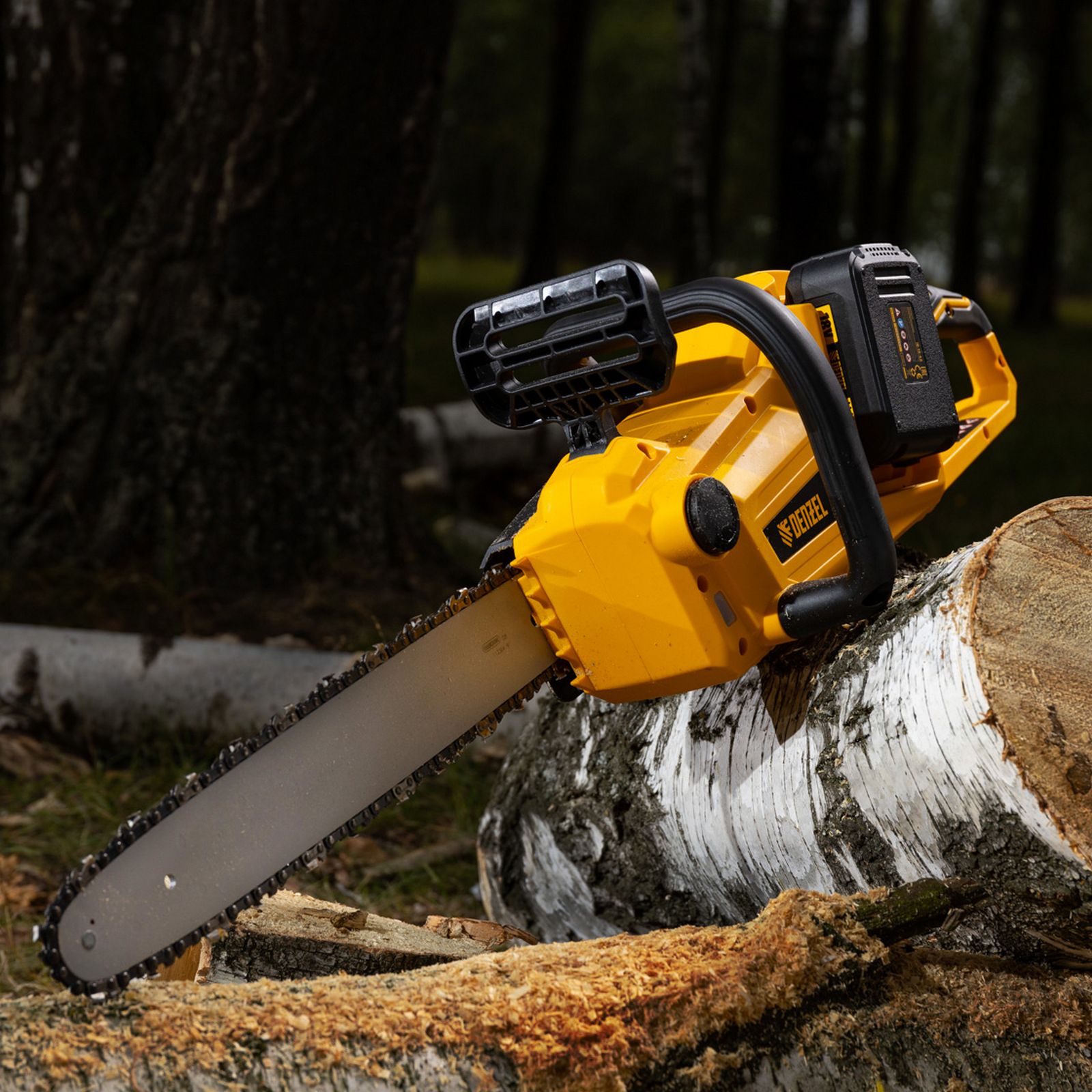 Аккумуляторная цепная пила Denzel RCS400-36 58610 с Li-ion аккумуляторами напряжением 36 В и шиной длиной 400 мм предназначена для валки деревьев, распила древесины, заготовки дров и прочих хозяйственных работ. Ультрасовременный бесщеточный двигатель обеспечивает вращение цепи со скоростью 19 м/c. Он превосходит щеточные аналоги по мощности, надежности и неприхотливости в обслуживании.,Пила функционирует от двух аккумуляторов увеличенной емкости 4 А*ч Li-ion 18 В с интеллектуальной системой распознавания нагрузки, которые позволяют эффективно работать без подзарядки долгое время. Модель поставляется с прочной и легкой шиной OREGON длиной 40 см и цепью с шагом 3/8 дюйма. Инструмент полностью укомплектован и готов к работе сразу после приобретения.