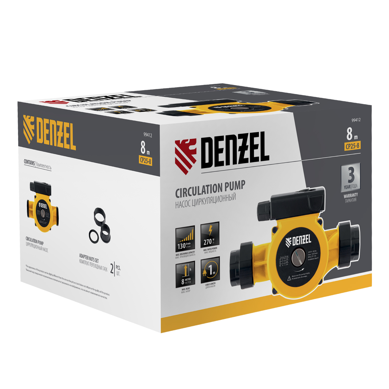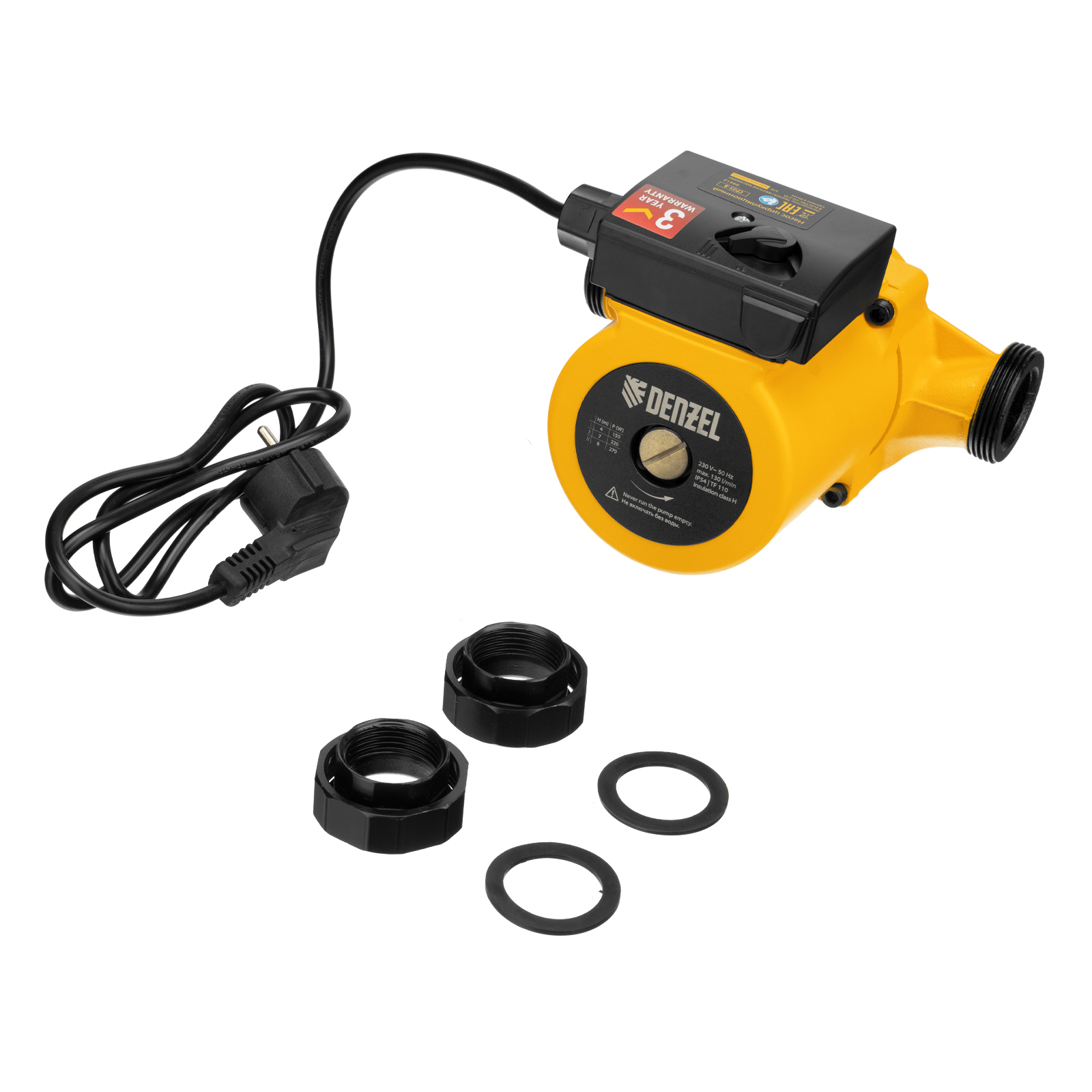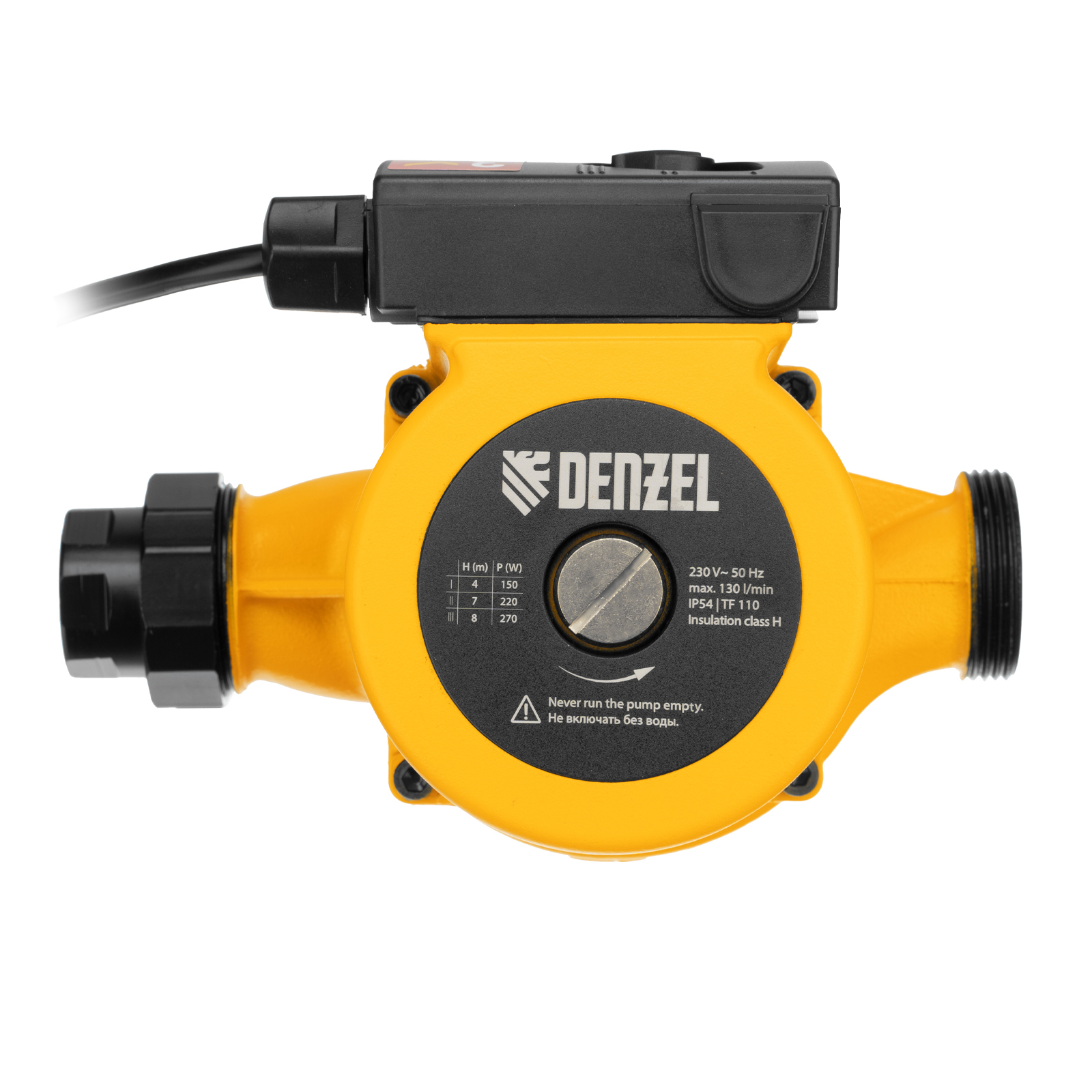 Циркуляционный насос Denzel CP25-8 99412 с кабелем длиной 1 м имеет монтажную длину 180 мм и обеспечивает напор до 8 м, максимальный объем перекачиваемой жидкости составляет 130 л/мин. Устройство обеспечивает непрерывное движение горячей воды температурой до 110 °C по трубопроводу. Насос позволит организовать эффективную систему теплоснабжения загородного дома.