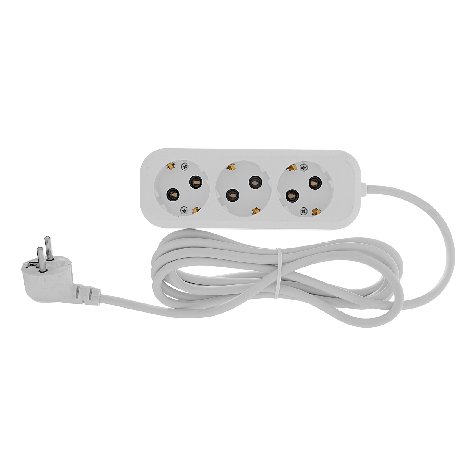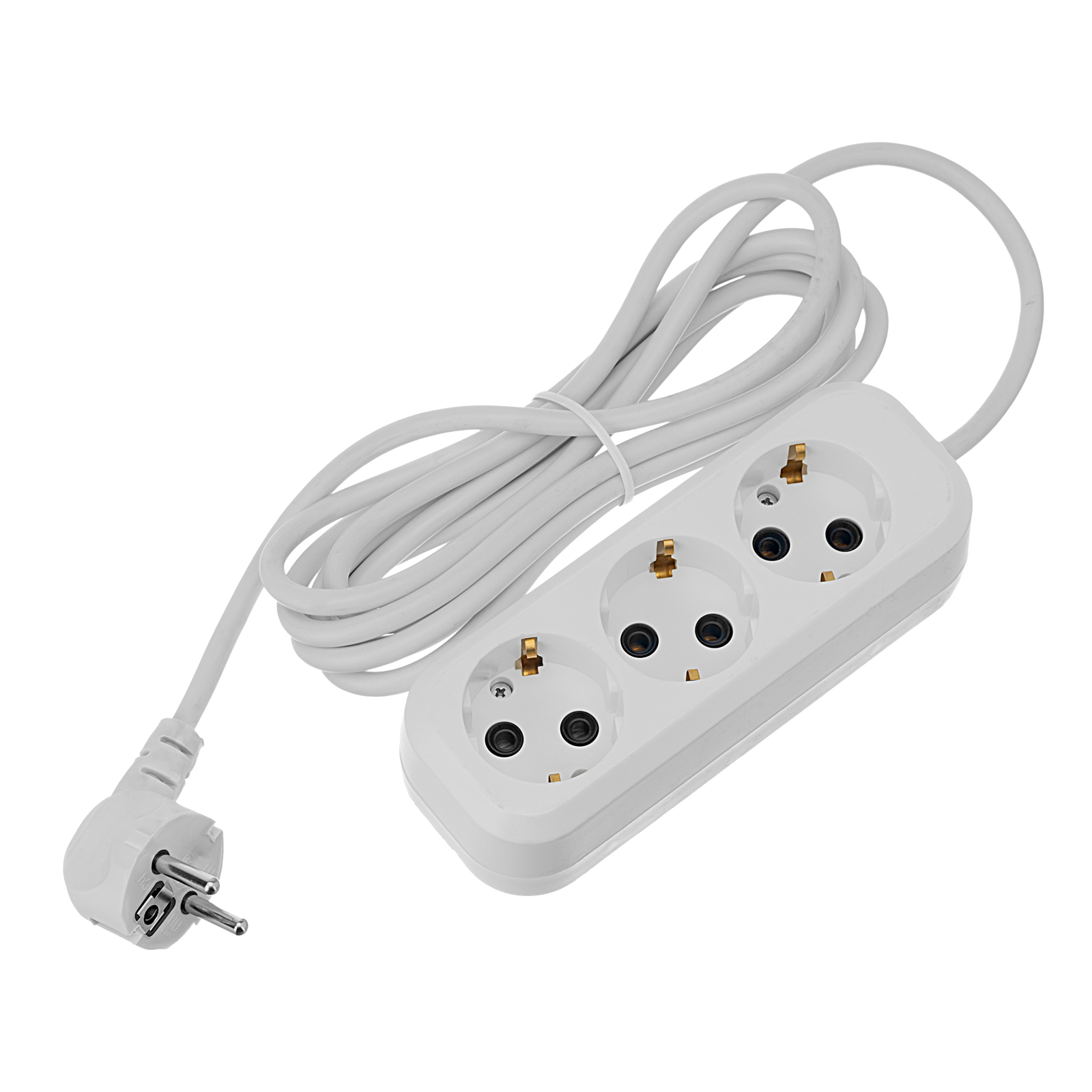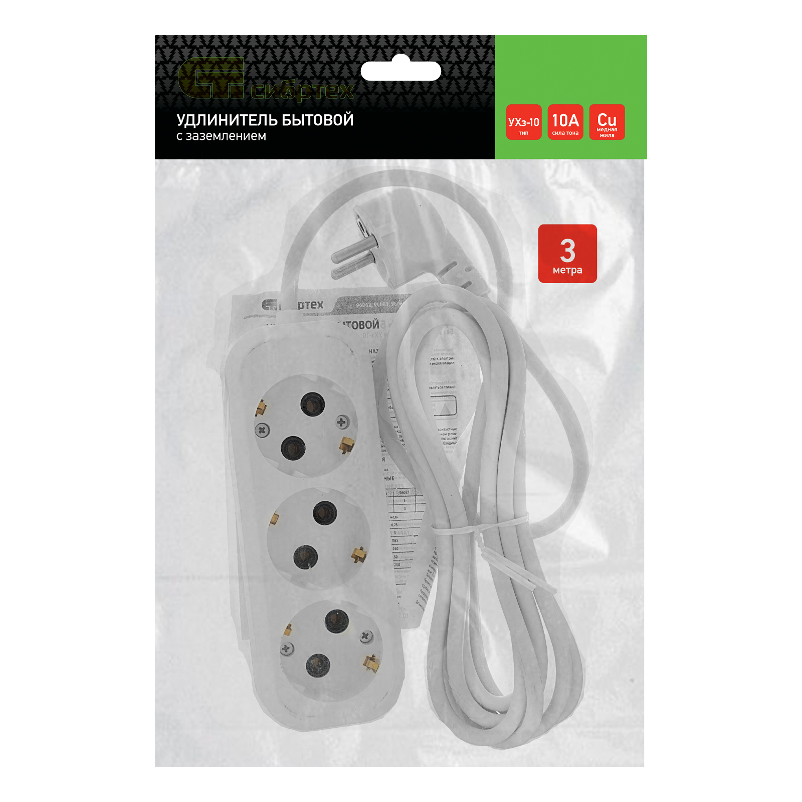 Белый бытовой удлинитель Сибртех 96066, тип УХз-10, 10 А, с заземлением, имеет 3 розетки для подключения бытовых и осветительных приборов на расстоянии до 3 м от источника электроснабжения. Медный кабель рассчитан на нагрузку не более 2200 Вт. Удлинитель удобен для бытового применения.