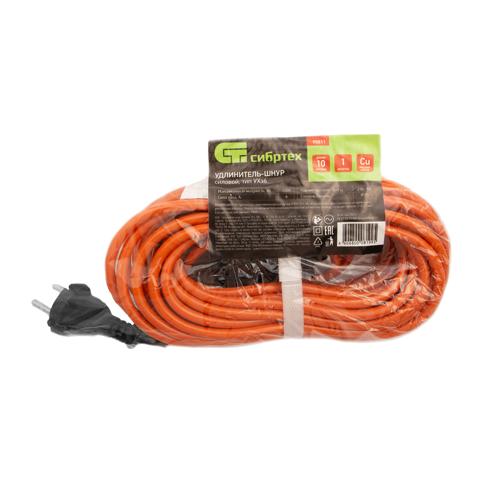 Силовой удлинитель-шнур Сибртех 95811 длиной 10 м, 6 А, тип УХз6, тип кабеля ПВС, используется для подключения к сети электрических приборов и инструментов, в том числе режущих, для чего предусмотрена 1 розетка без заземления. Крученый медножильный кабель рассчитан на нагрузку до 1200 Вт. Оболочка яркого оранжевого цвета хорошо заметна в условиях плохой видимости, в траве и среди строительного мусора. Сетевой удлинитель применяется во время строительных и монтажных работ, а также дома, в гараже или на даче.