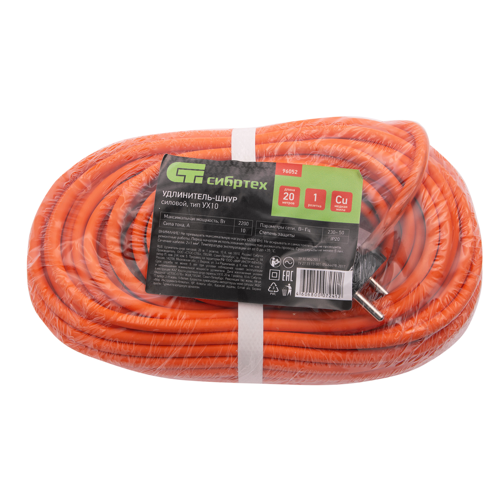 Силовой удлинитель-шнур Сибртех 96052, тип УХ10, с 1 розеткой, рассчитан на силу тока 10 A и позволяет подключать к электросети электроприборы мощностью до 2200 Вт на расстоянии до 20 м от источника электроснабжения. Яркий оранжевый кабель хорошо заметен даже в густой траве и среди строительного мусора. Сетевой удлинитель используется во время строительных и монтажных работ, а также пригодится дома, на даче или в гараже.