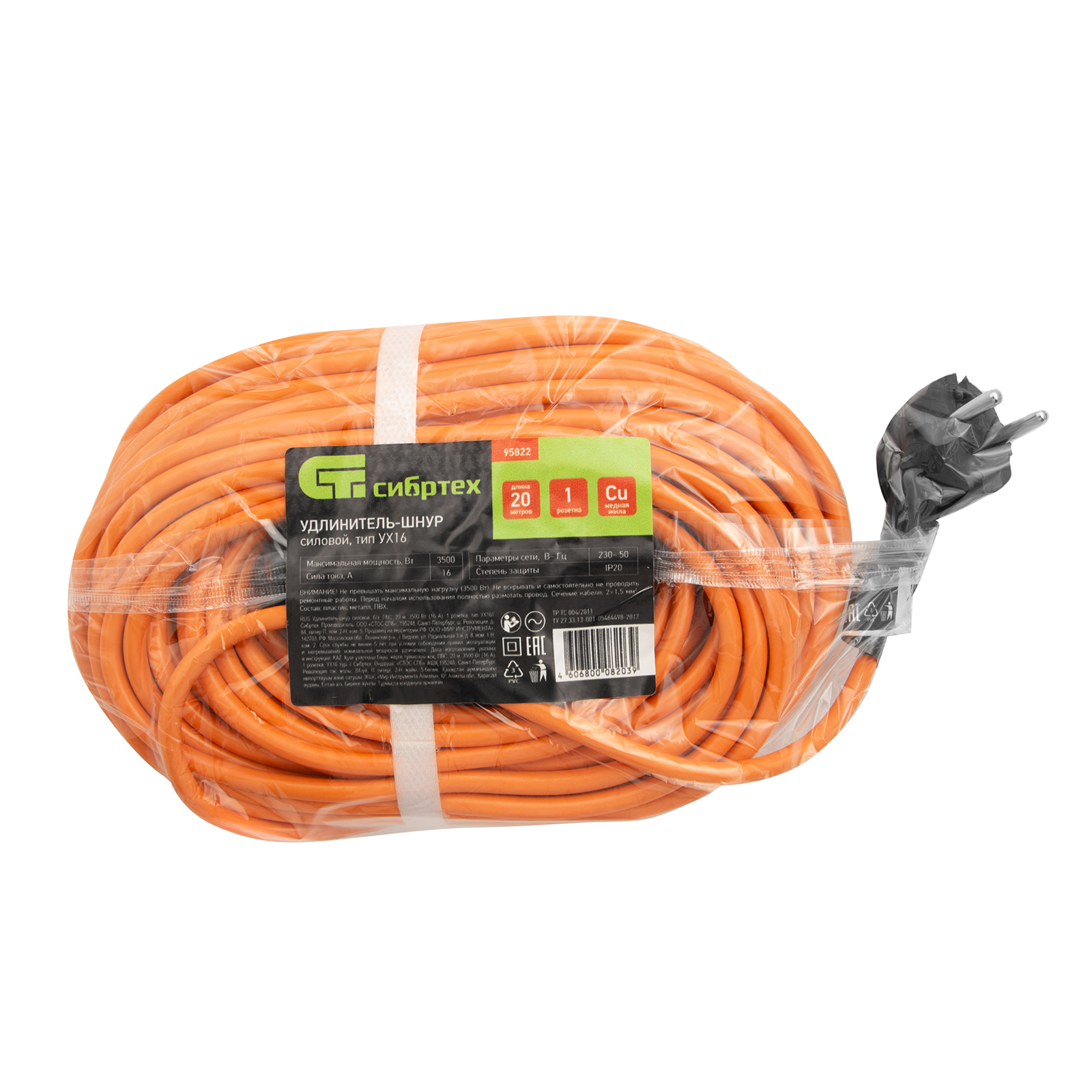 Удлинитель-шнур силовой 20 м, 16А, тип УХ16, ПВС, 1 розетка без заземления Сибртех