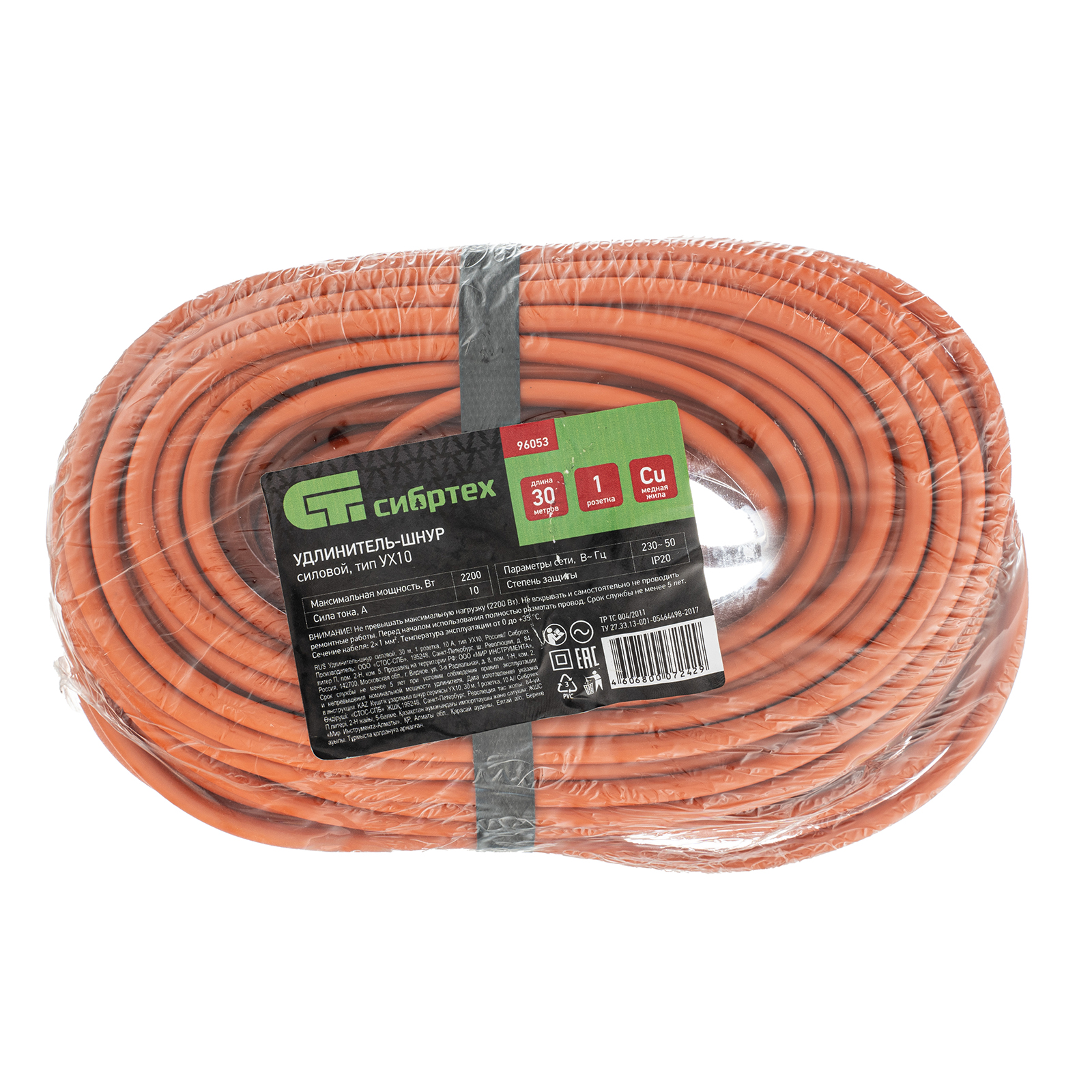 Силовой удлинитель-шнур Сибртех 96053, тип УХ10, с 1 розеткой, рассчитан на силу тока 10 A и позволяет подключать к электросети электроприборы мощностью до 2200 Вт на расстоянии до 30 м от источника электроснабжения. Яркий оранжевый кабель хорошо заметен даже в густой траве и среди строительного мусора. Сетевой удлинитель используется во время строительных и монтажных работ, а также пригодится дома, на даче или в гараже.