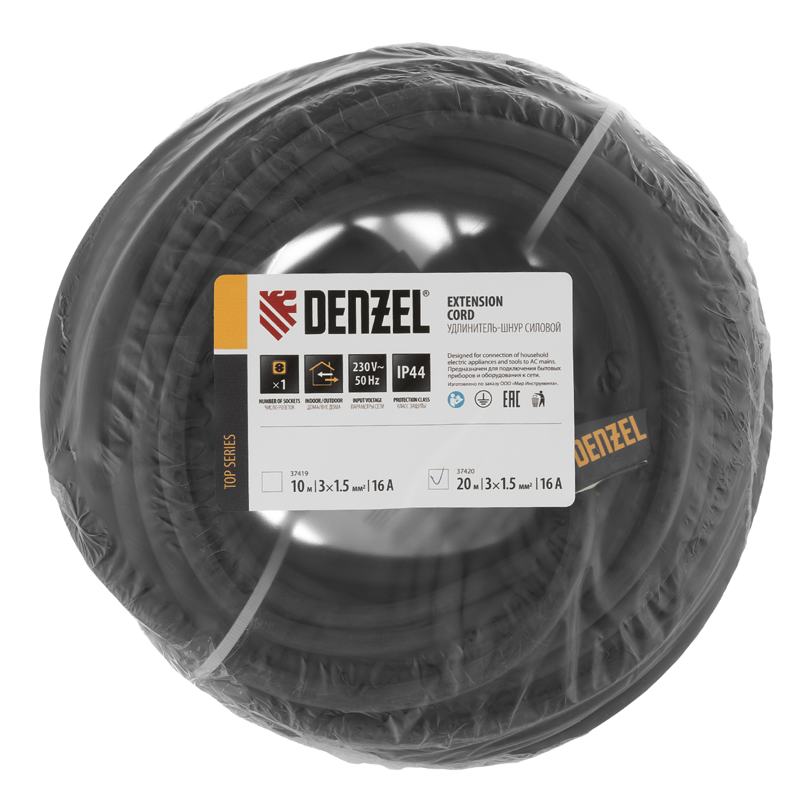 Силовой удлинитель-шнур Denzel Top Series 37420 с 1 розеткой, с кабелем КГТТ сечением 3 x 1,5 мм и длиной 20 м, предназначен для подключения электроприборов на удалении от розетки. Максимальная мощность потребителя составляет 3680 Вт для полностью размотанного кабеля и 1840 Вт — для смотанного. Удлинитель подходит для подключения электроинструмента, будет полезен на строительной площадке и в быту.