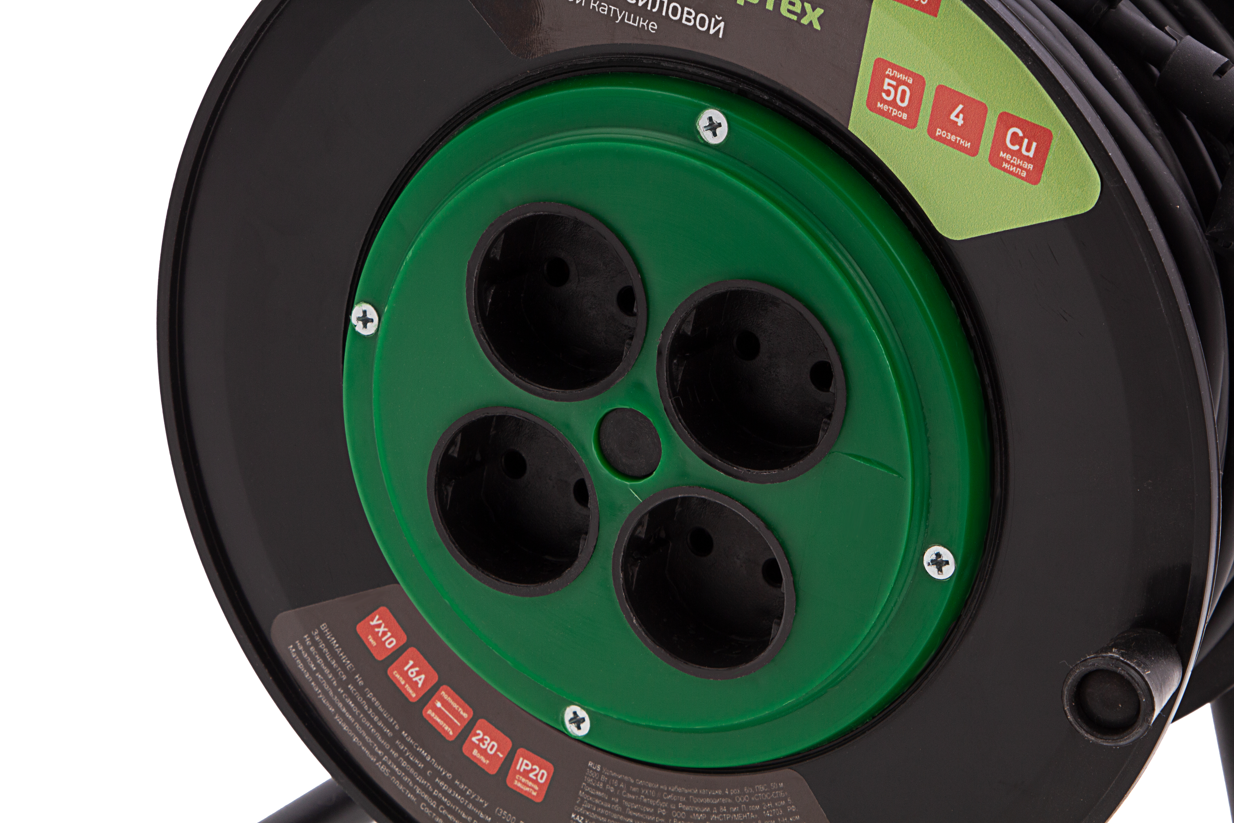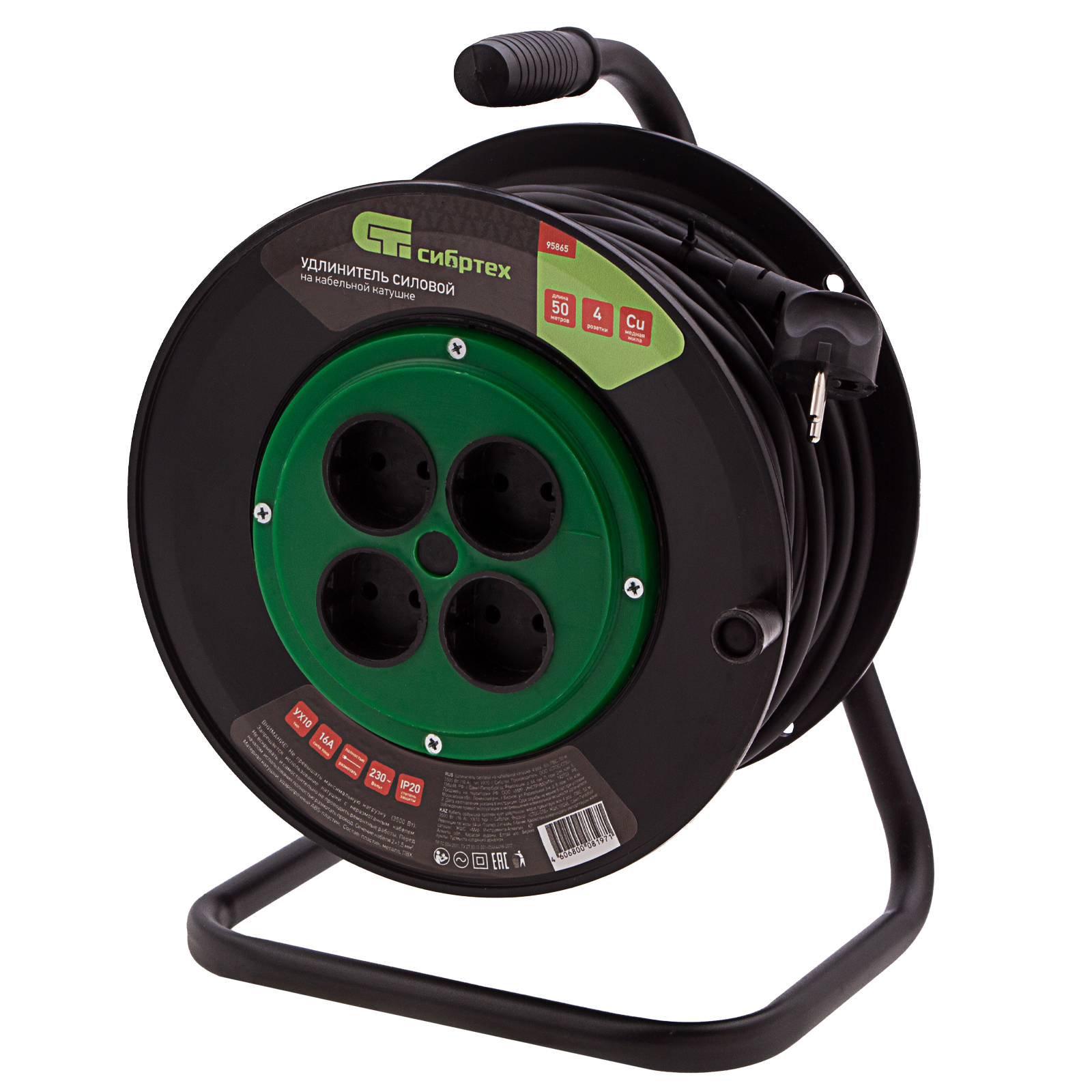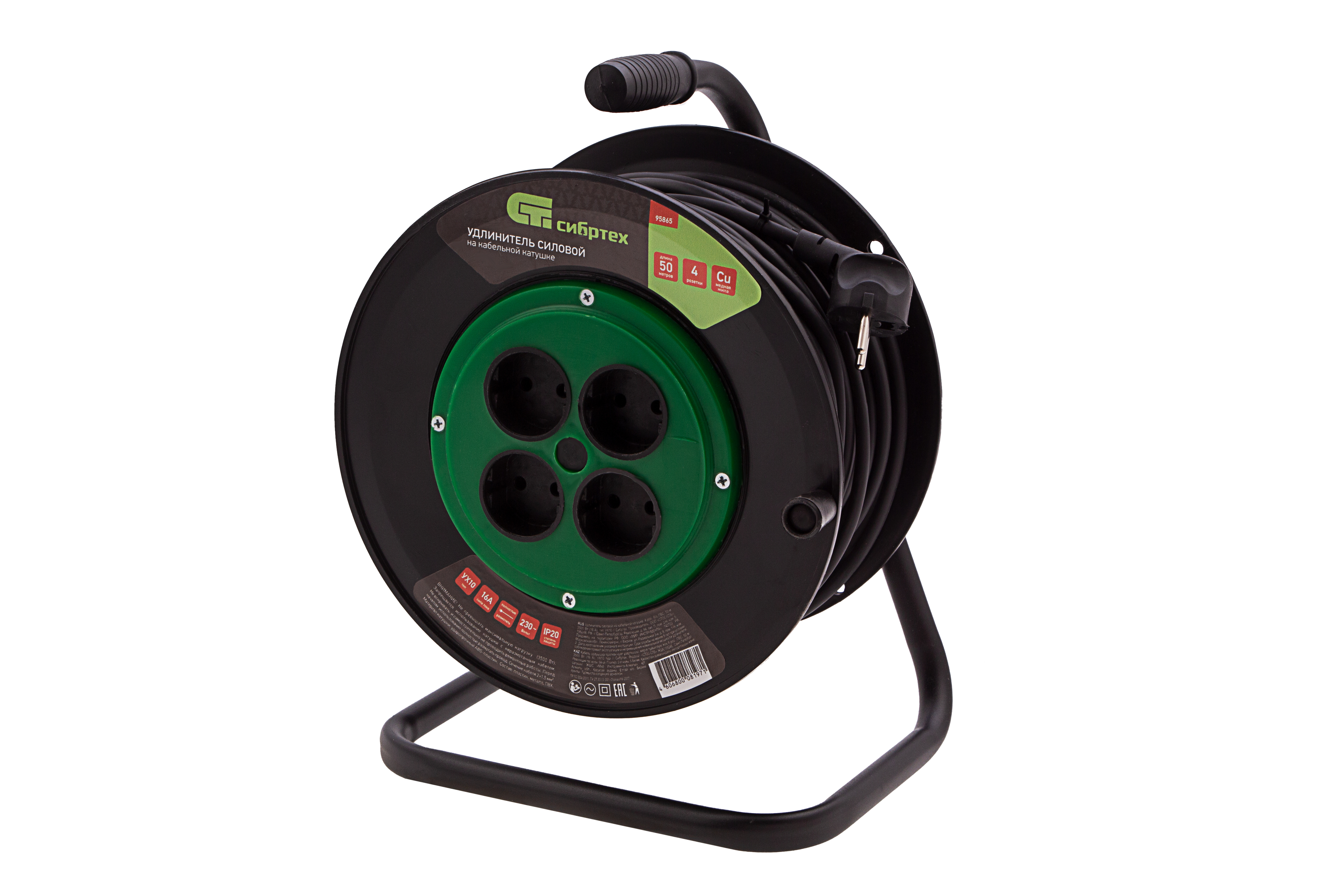 Силовой удлинитель Сибртех 95865 типа УХ10, 16 А, тип кабеля ПВС, на кабельной катушке, с 4 розетками, используется для подключения электроприборов на расстоянии до 50 м от стационарного источника электропитания. При этом суммарная мощность подключенных потребителей энергии не должна превышать 3500 Вт. Металлическая стойка сетевого удлинителя полая внутри, что облегчает конструкцию. Удлинитель пригодится во время строительных работ на дачном участке.