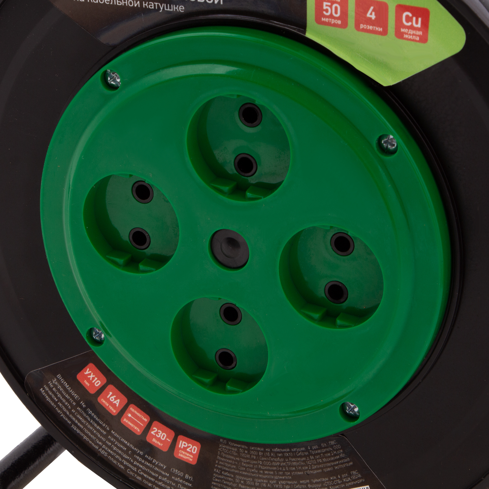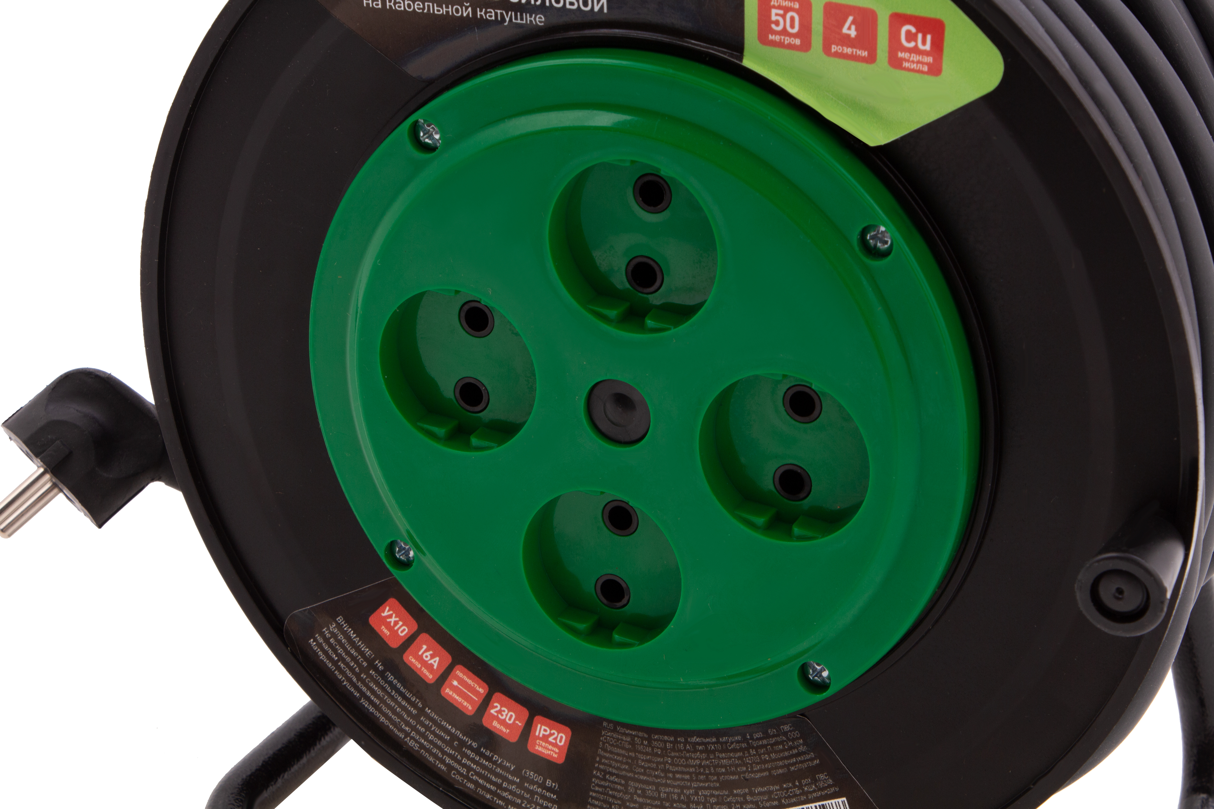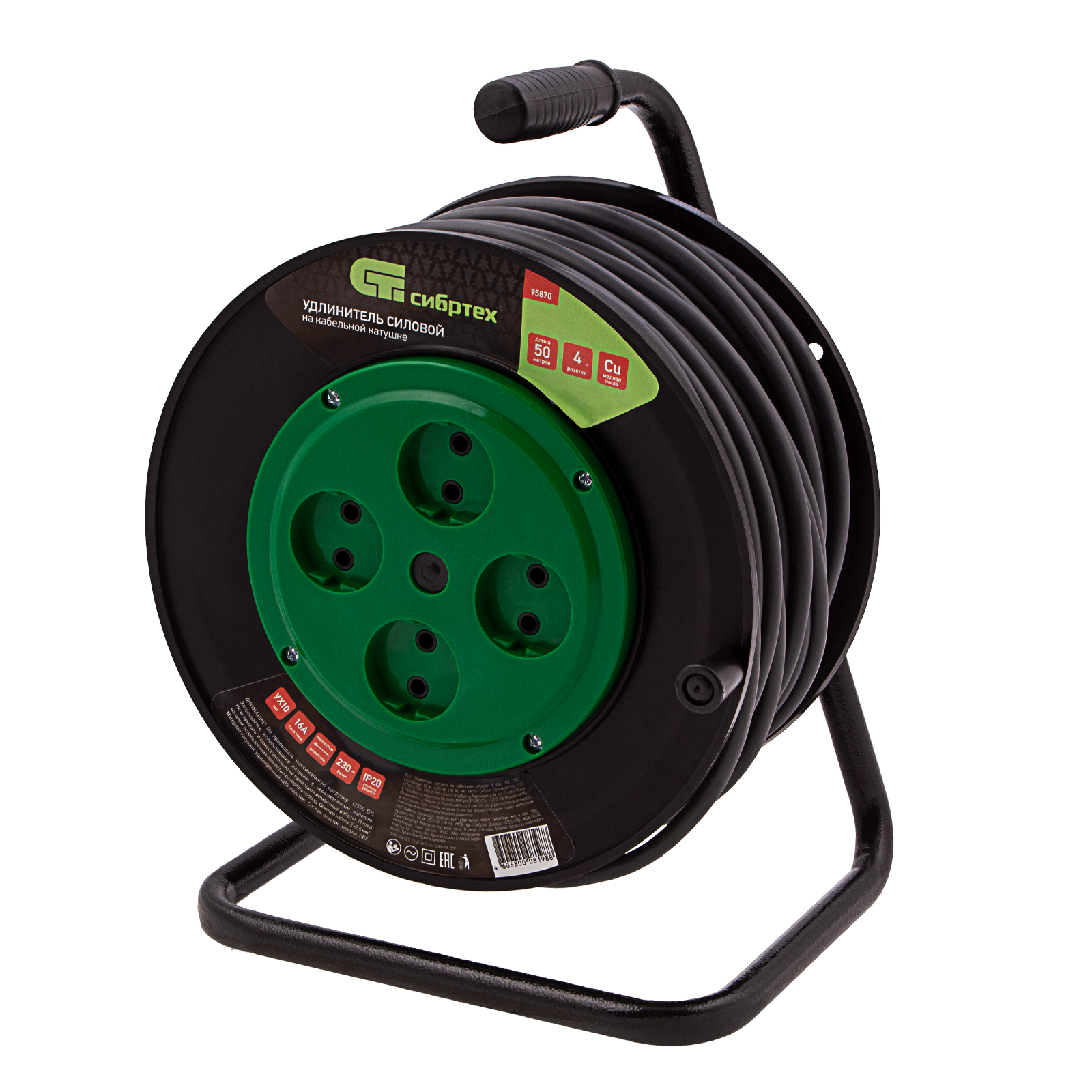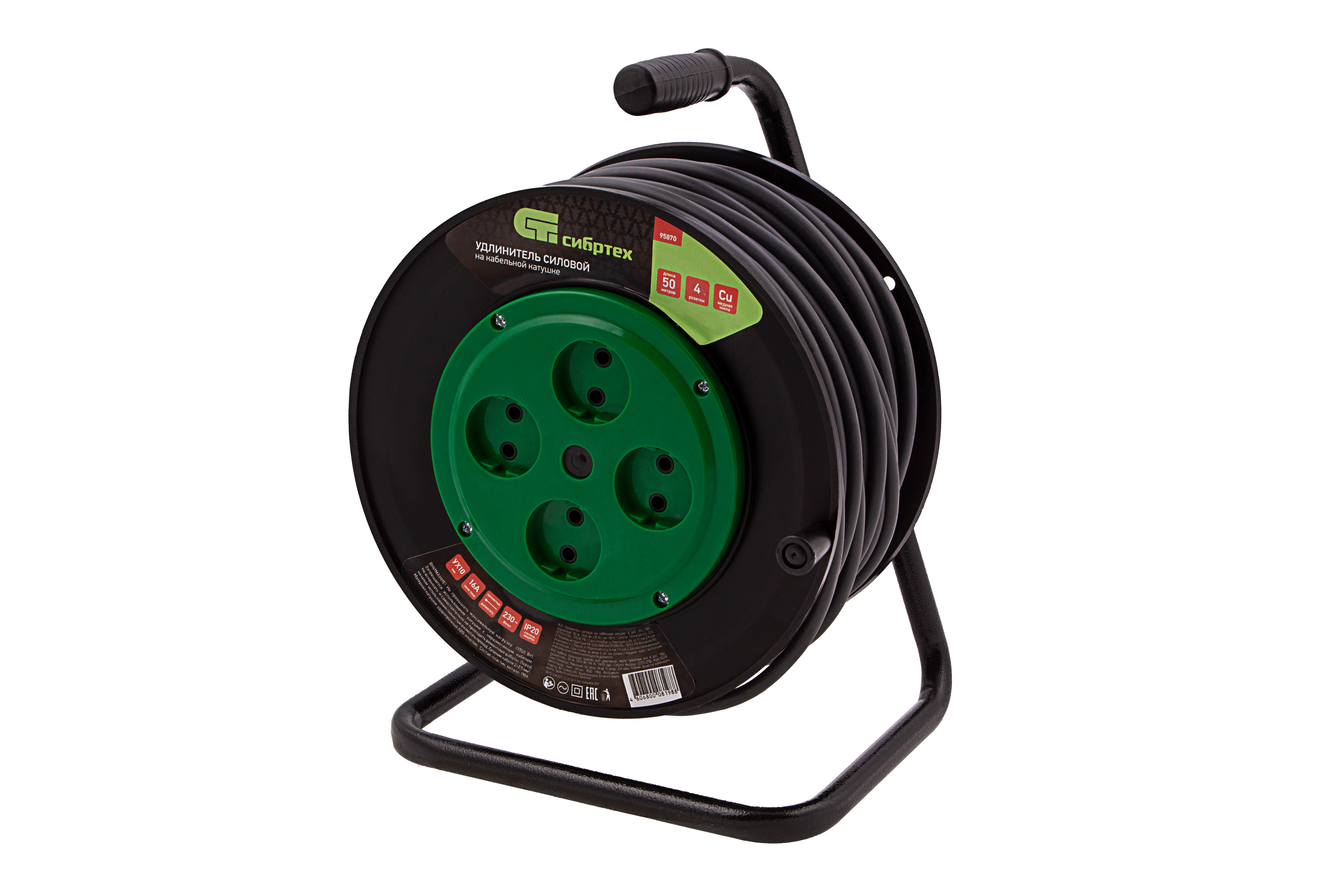 Усиленный силовой удлинитель на кабельной катушке Сибртех 95870, 16 А, тип УХ10, тип кабеля ПВС, с 4 розетками без заземления, позволяет подключать к сети электрооборудование на расстоянии до 50 м от стационарного источника питания. Медный кабель с сечением 2 х 2,5 кв. мм выдерживает нагрузку до 3500 Вт. Корпус выполнен из пластика, а металлическая стойка полая внутри, уменьшен вес сетевого удлинителя и его удобно переносить. Устройство предназначено для выполнения бытовых и профессиональных строительных работ, пригодится также на даче и в автомастерской.