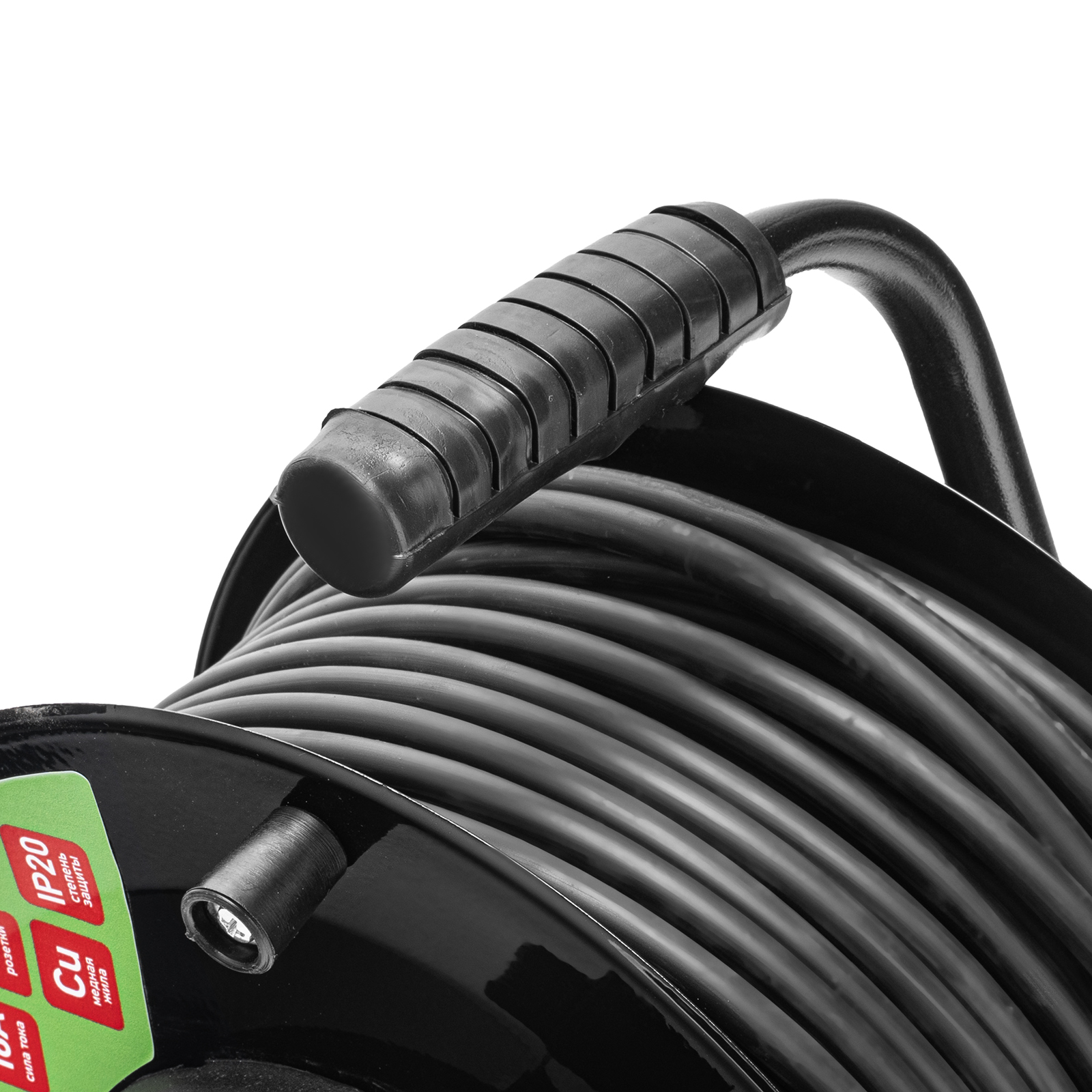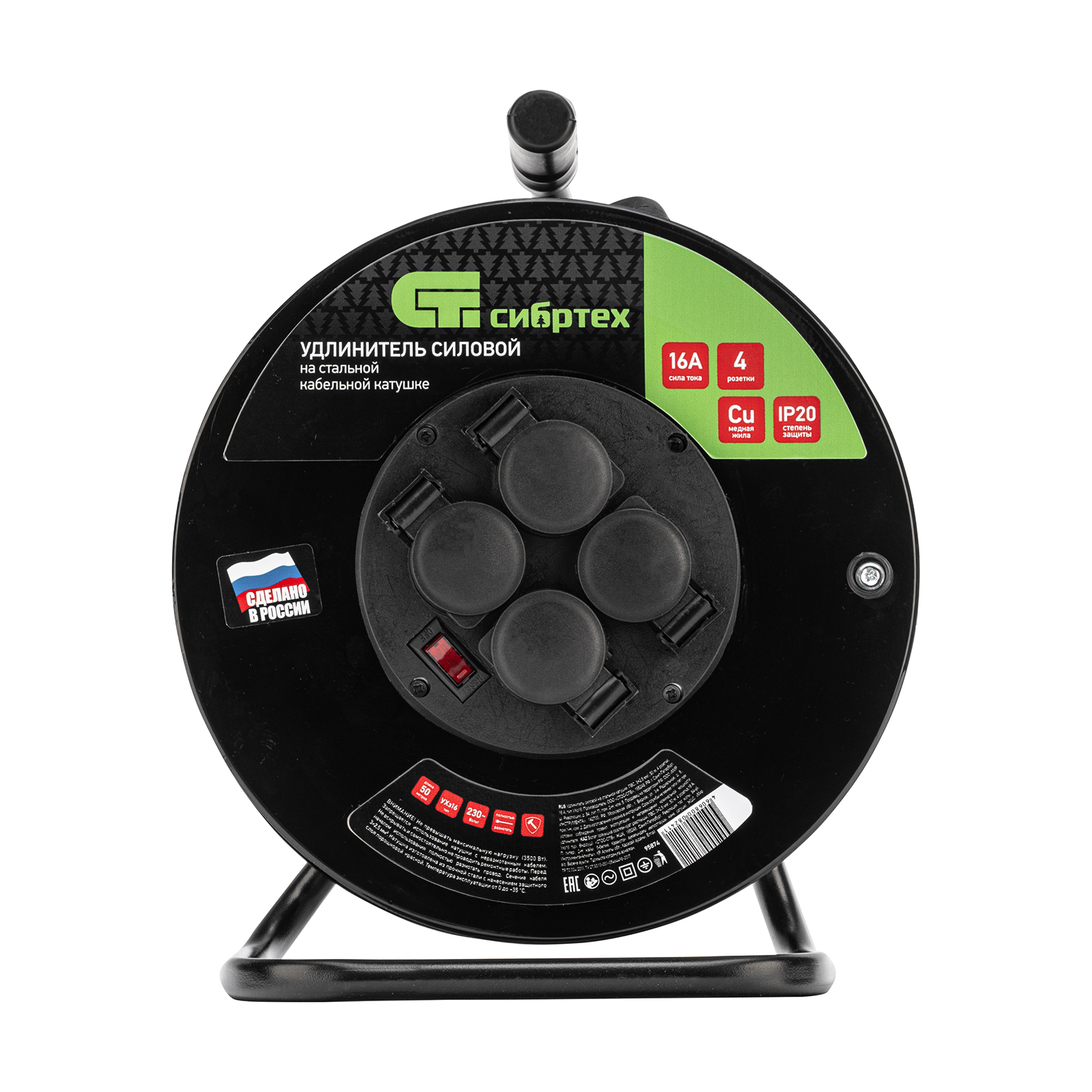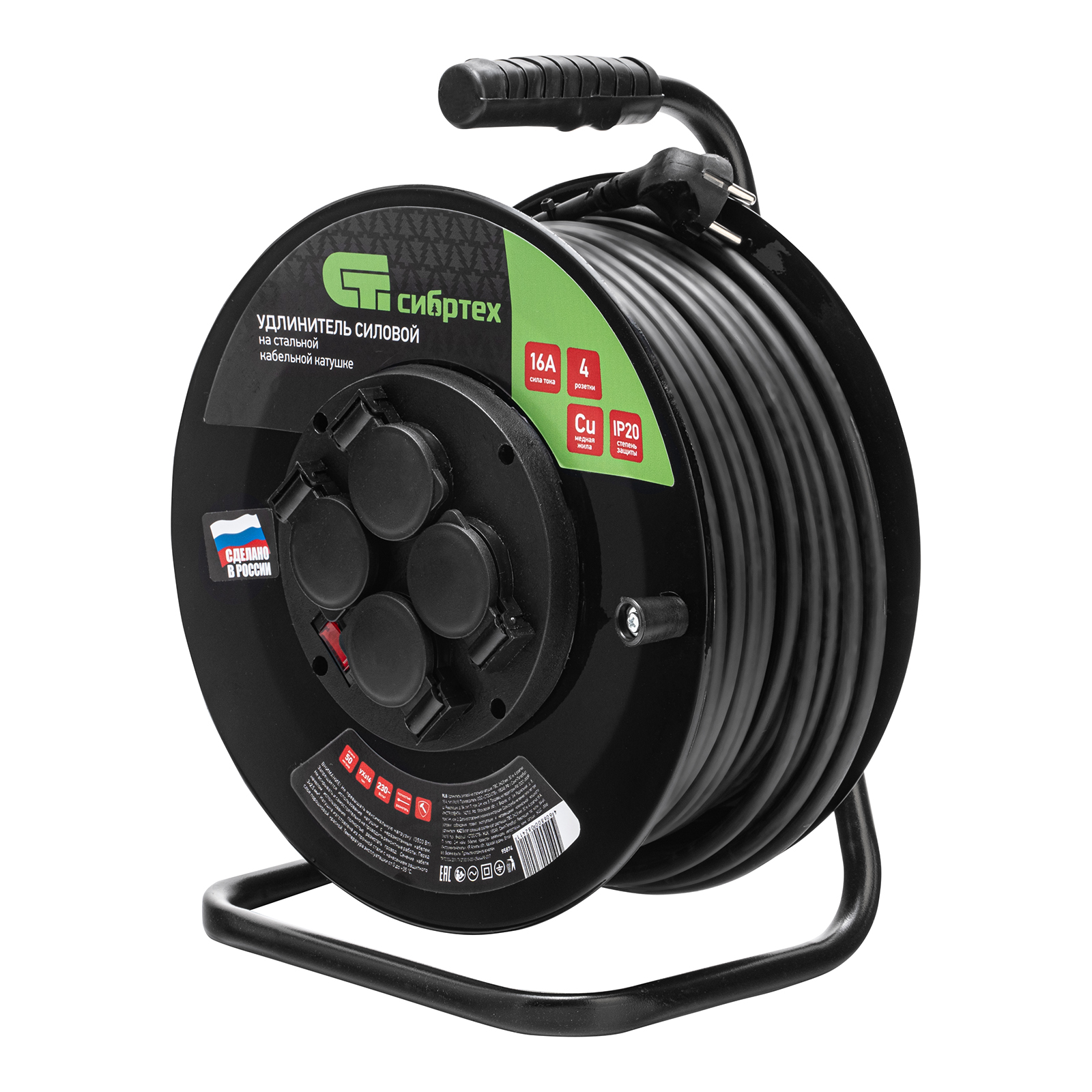 Силовой удлинитель Сибртех 95874, 16 А, 50 м, тип УХз16, кабель ПВС 3 х 2,5 мм, на стальной катушке, имеет 4 розетки и позволяет подключать к сети электрооборудование суммарной мощностью не более 3500 Вт. Удобная ручка облегчает разматывание и сматывание кабеля. Заземляющие контакты розеток защищают пользователя от поражения электрическим током. Сетевой удлинитель будет полезен на строительной площадке и на производстве.