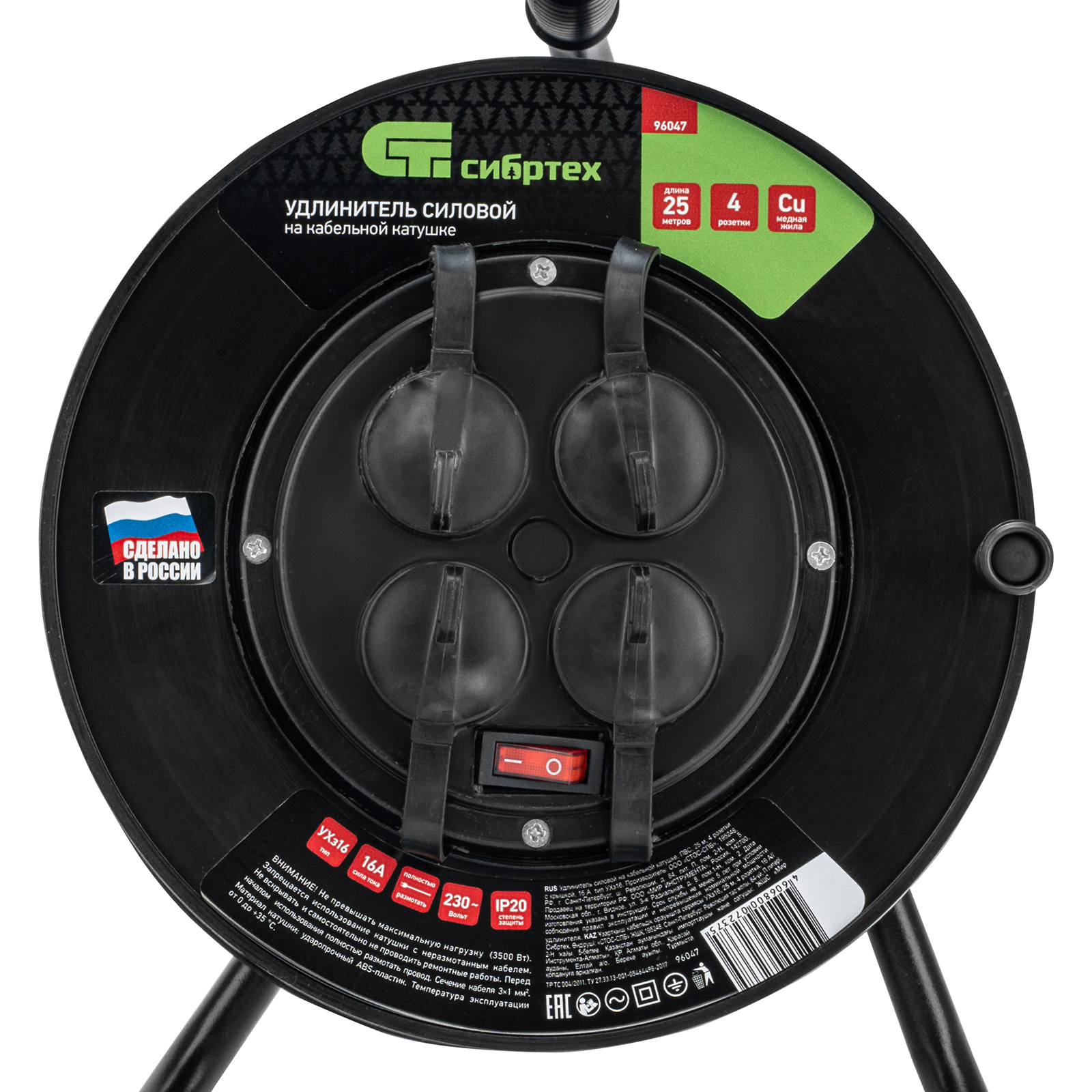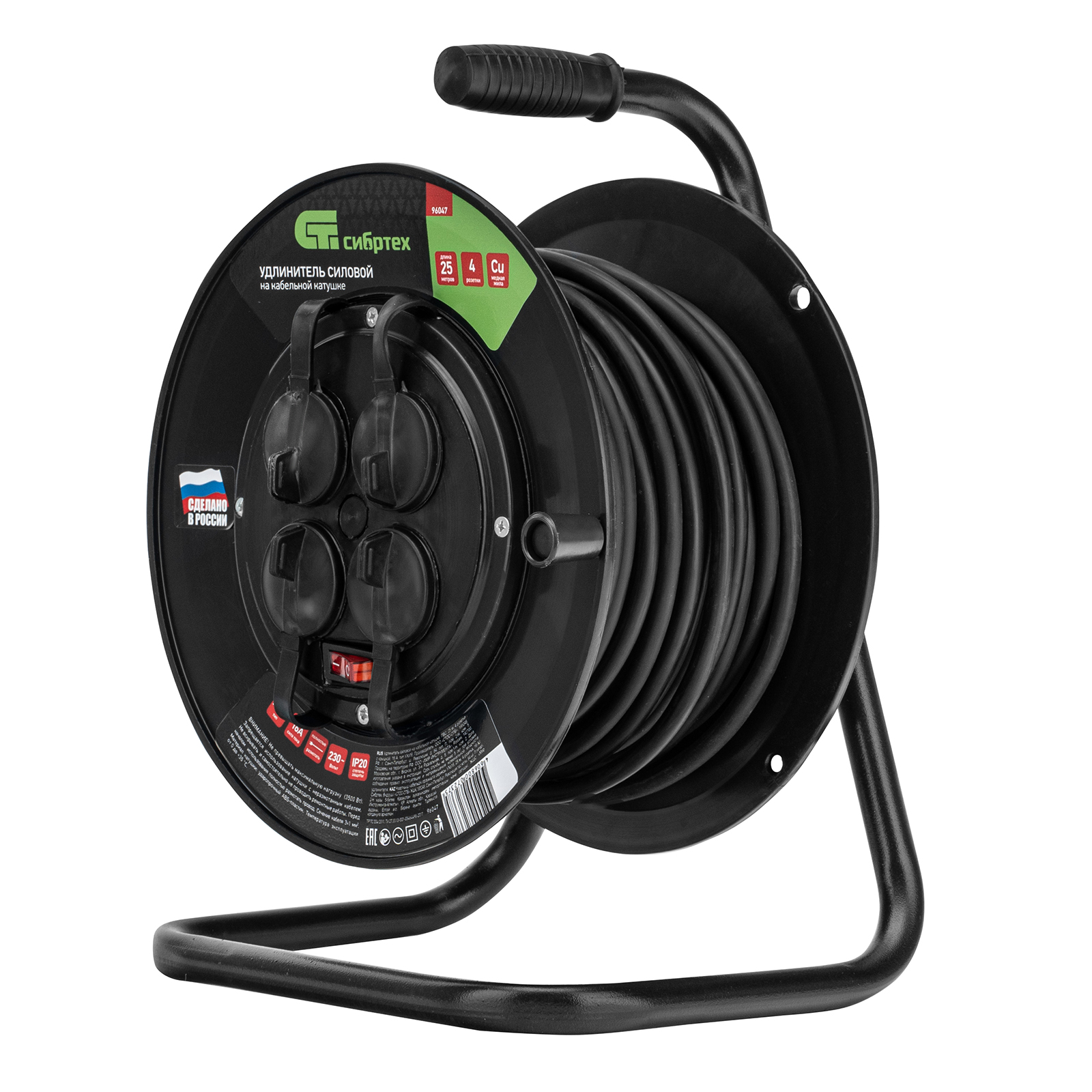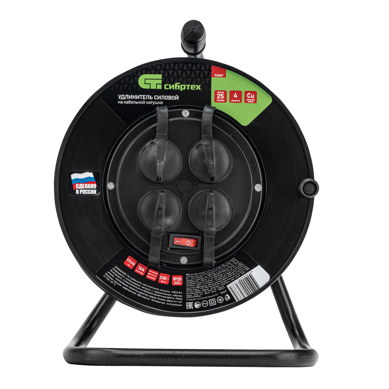 Силовой удлинитель на кабельной катушке Сибртех 96047 типа УХз16, со степенью защиты IP44, рассчитан на силу тока 16 А и имеет 4 розетки с крышкой для подключения различного электрооборудования суммарной мощностью 3500 Вт, используемого на расстоянии до 25 м от стационарного источника питания. Удобная рукоятка облегчает разматывание и сматывание кабеля. Заземляющие контакты розеток предотвращают поражение пользователя электрическим током. Розетки закрываются крышками, защищающими разъемы от попадания влаги и грязи. Сетевой удлинитель пригодится для работы с инструментом на строительной площадке или дачном участке.