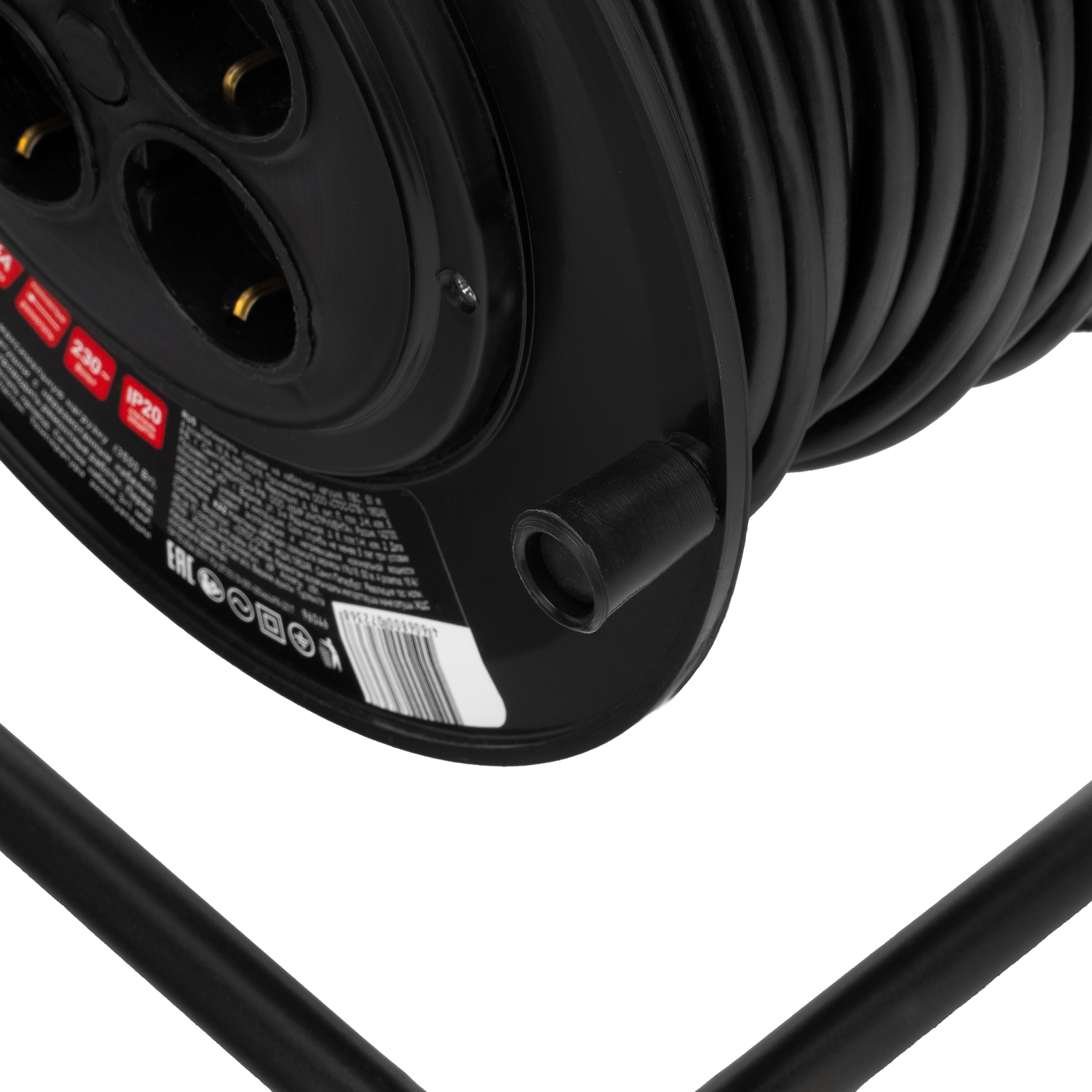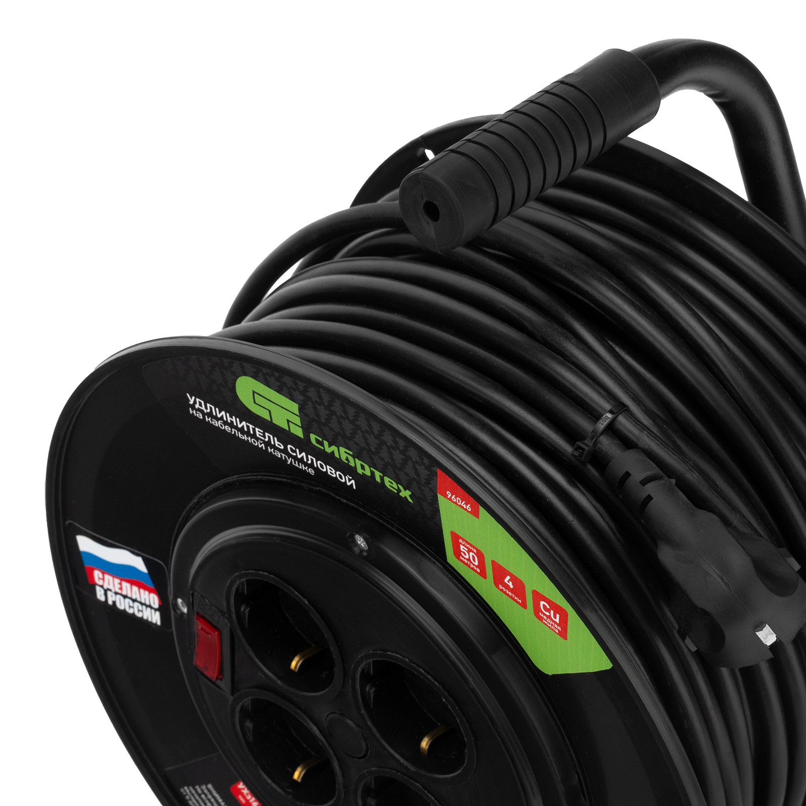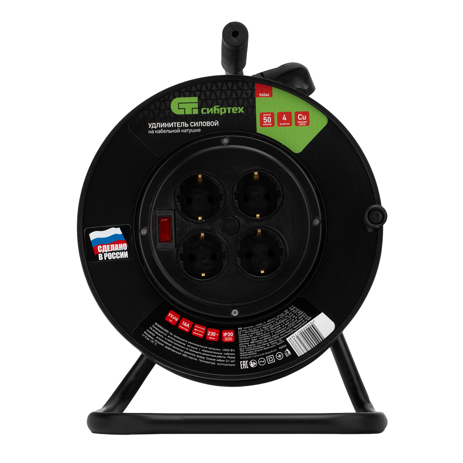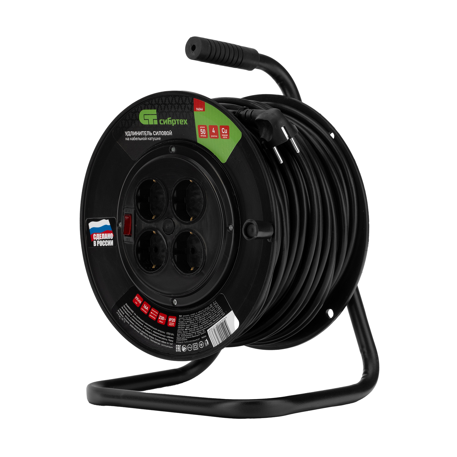 Силовой удлинитель Сибртех 96046 типа УХз16, 16 А, тип кабеля ПВС, на кабельной катушке, с 4 розетками, используется для подключения электроприборов на расстоянии до 50 м от стационарного источника электропитания. При этом суммарная мощность подключенных потребителей энергии не должна превышать 3500 Вт. У розеток имеются заземляющие контакты для защиты пользователя от поражения электрическим током. Металлическая стойка сетевого удлинителя полая внутри, что облегчает конструкцию. Удлинитель пригодится во время строительных работ на дачном участке.
