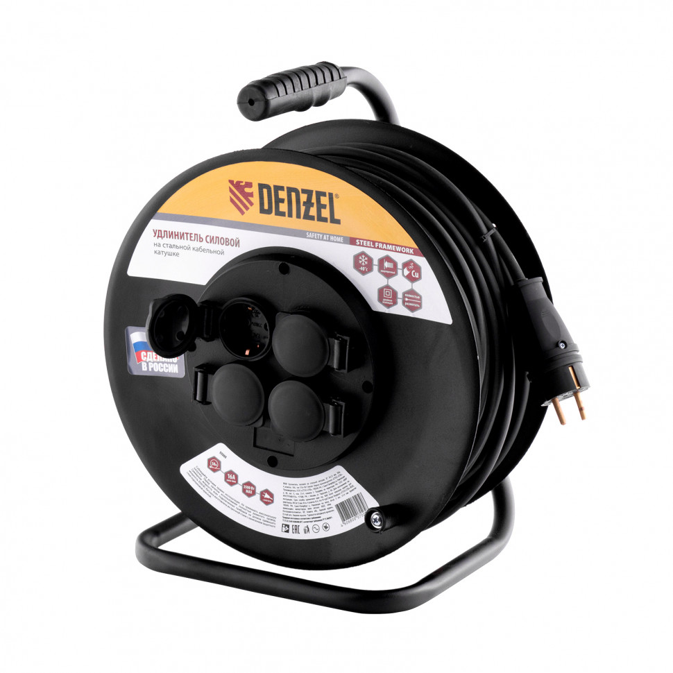 Силовой удлинитель на стальной катушке Denzel 95993 серии УХз-16, с кабелем типа КГ с сечением 3 х 2,5 мм, с 4 розетками, рассчитан на силу тока 16 А и позволяет работать с электрооборудованием на расстоянии до 50 м от источника питания. Медножильный кабель выдерживает нагрузку до 3500 Вт. Кабель типа КГ устойчив к температуре от -40 °С до +50 °C, поэтому удлинитель подходит для профессионального использования в строительстве и на производстве.