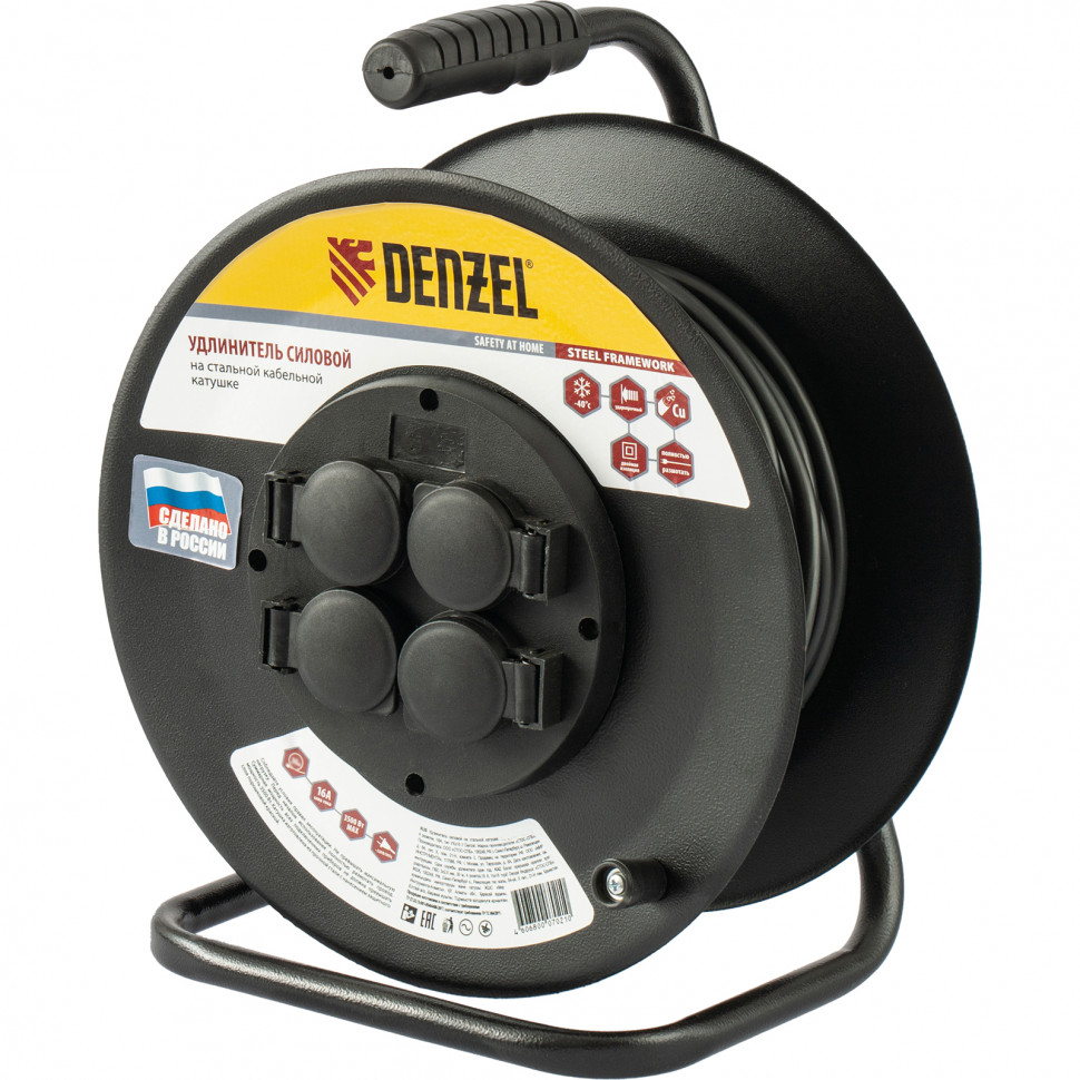 Силовой удлинитель на стальной катушке Denzel 95983 серии УХз-16, с кабелем типа ПВС, сечением 3 х 2,5 мм и длиной 20 м, рассчитан на силу тока 16 А и имеет 4 розетки, к которым можно подключить оборудование суммарной мощностью не более 3500 Вт. Заземляющие контакты розеток предотвращают получение пользователем электротравмы в случае утечки тока. Розеточная группа выполнена из пластика, а металлическая опора полая, что уменьшает вес изделия и облегчает его перемещение. Удлинитель используется для профессиональных строительных работ, а также востребован на производственных предприятиях.