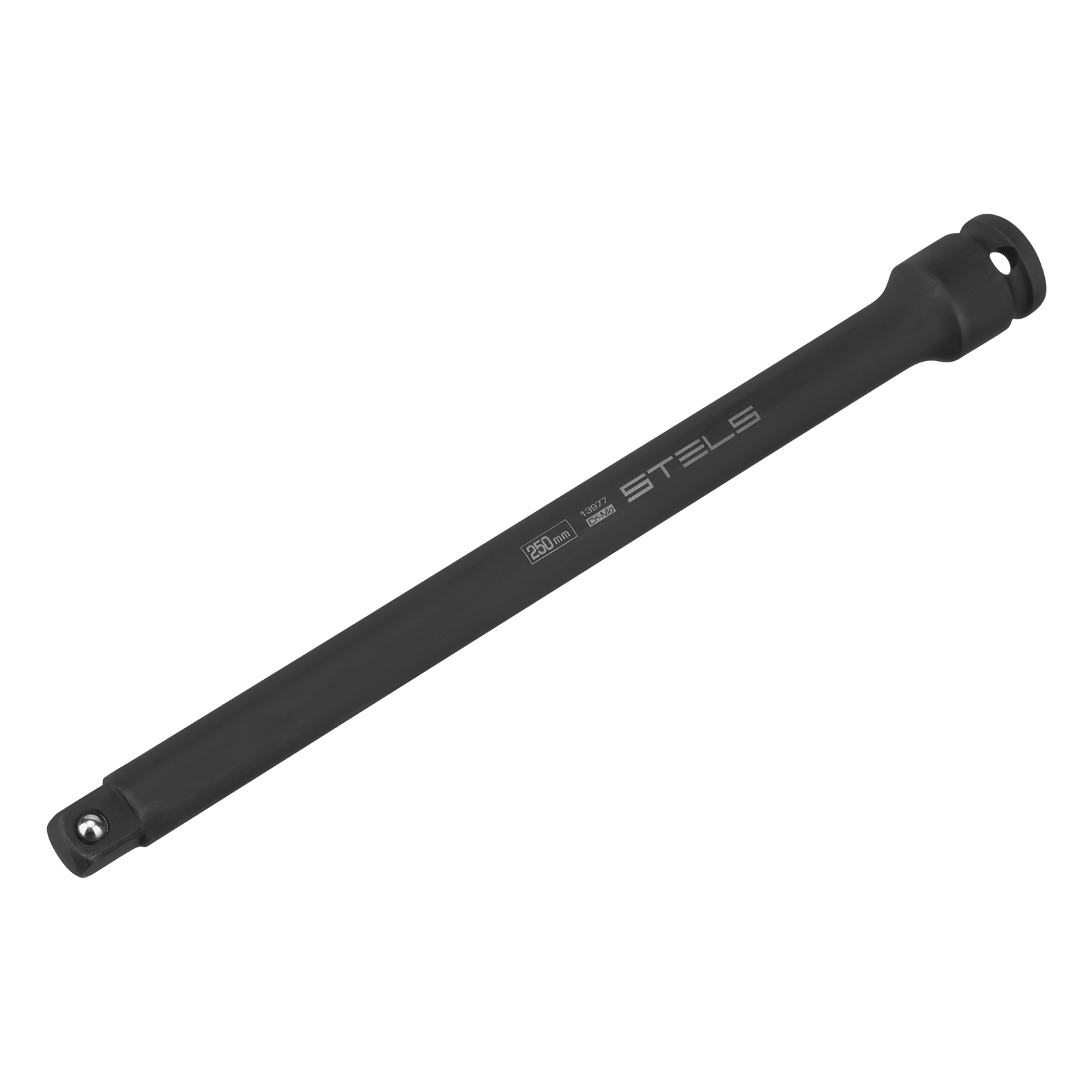 Ударный удлинитель Stels 13977 длиной 250 мм, с посадочным местом и присоединительным квадратом 1/2", используется для проведения монтажа и демонтажа резьбового крепежа в малодоступных местах. Будет полезен на предприятии автосервиса и в слесарной мастерской.