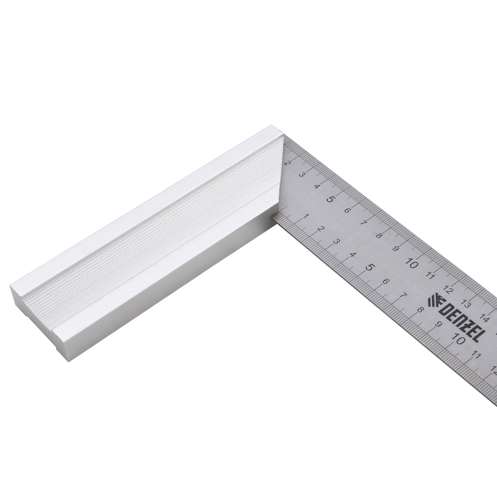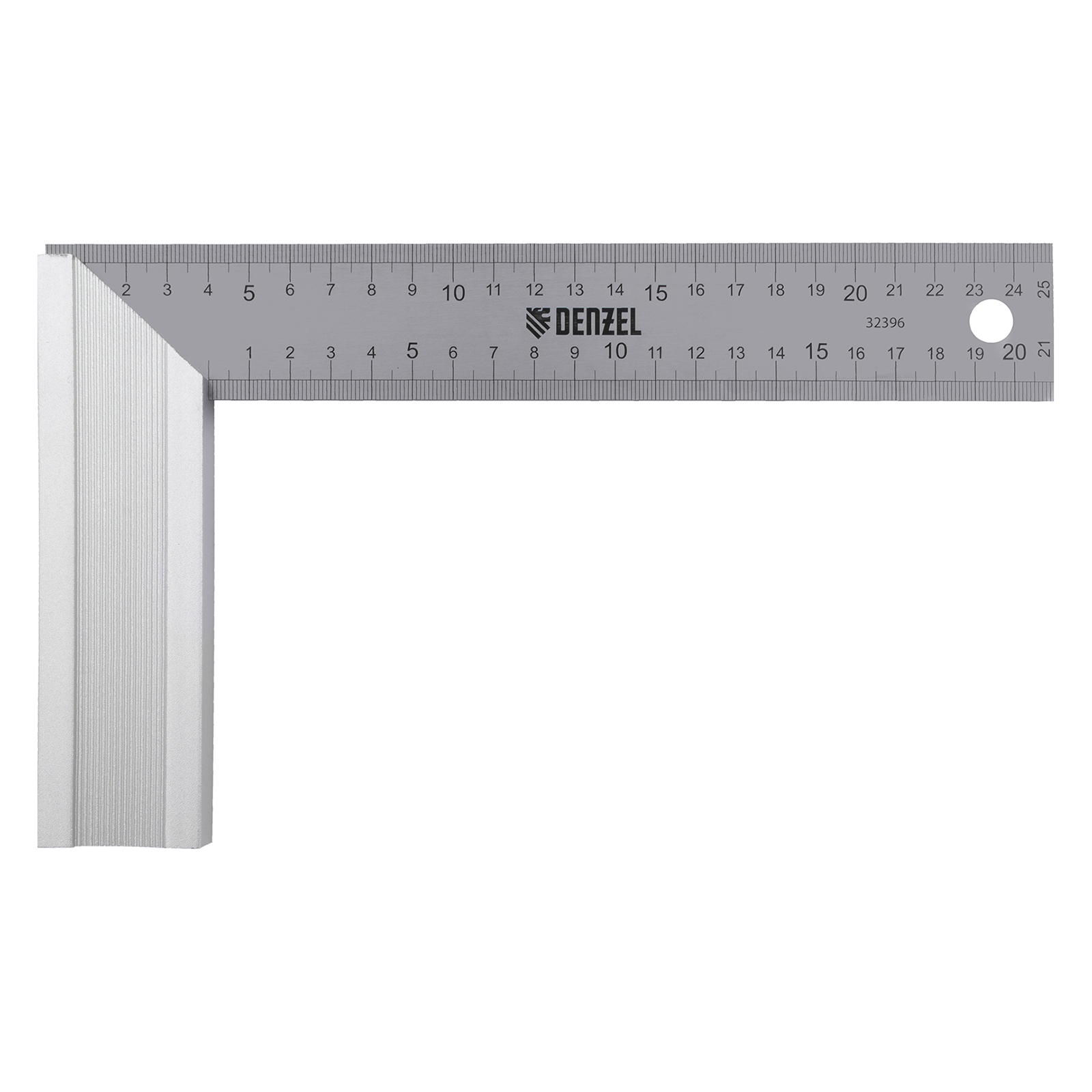 Стальной угольник Denzel 32396 длиной 250 мм, с градуировкой, алюминиевым основанием и полотном из нержавеющей стали, используется для построения и контроля углов. Будет полезен для выполнения столярных и строительных работ.