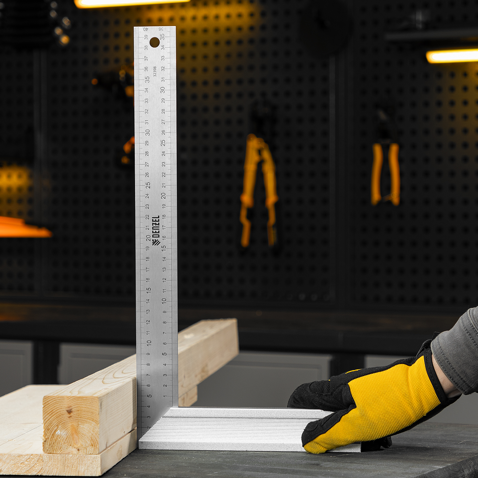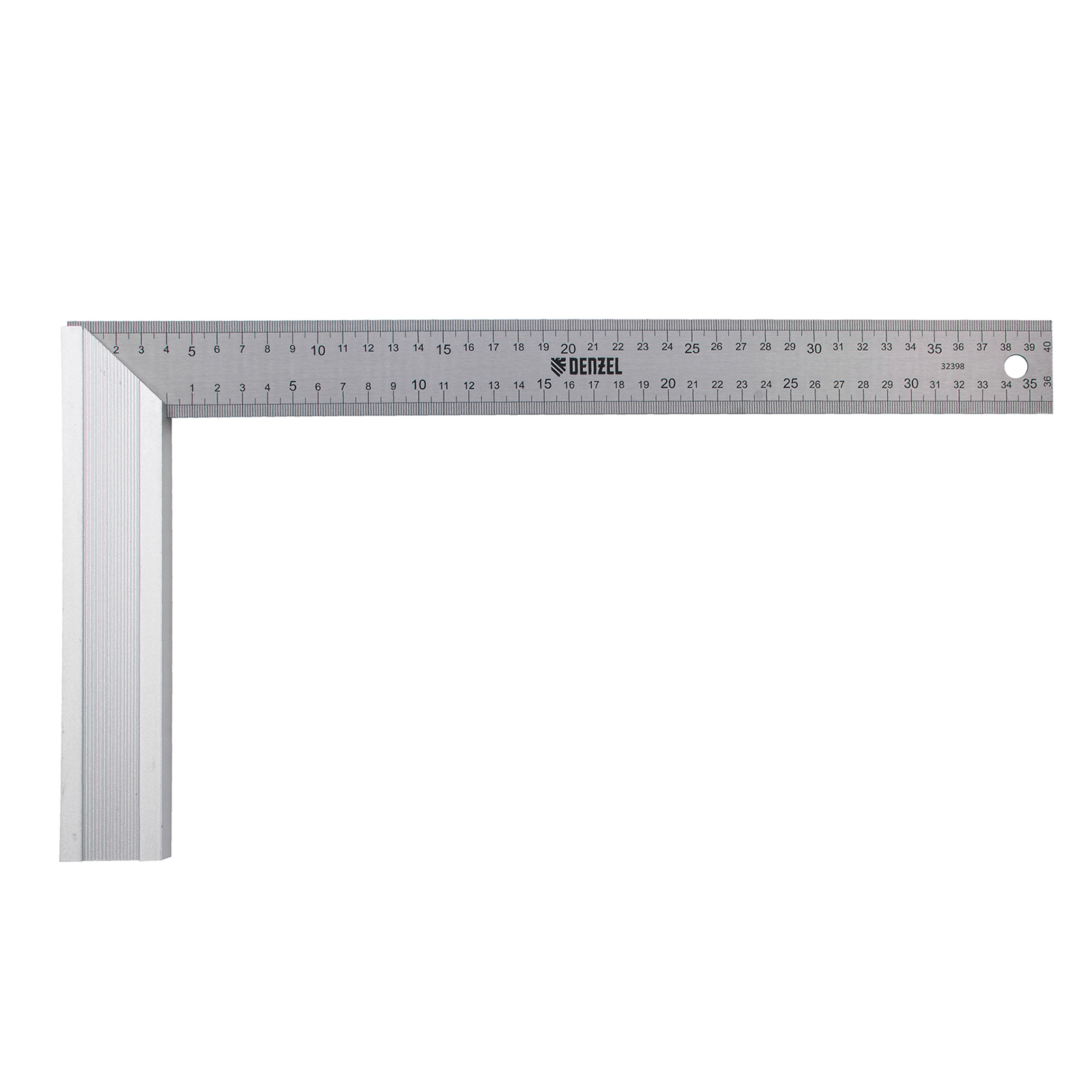 Стальной угольник Denzel 32398 длиной 400 мм, с градуировкой, алюминиевым основанием и полотном из нержавеющей стали, используется для построения и контроля углов. Будет полезен для выполнения столярных и строительных работ.