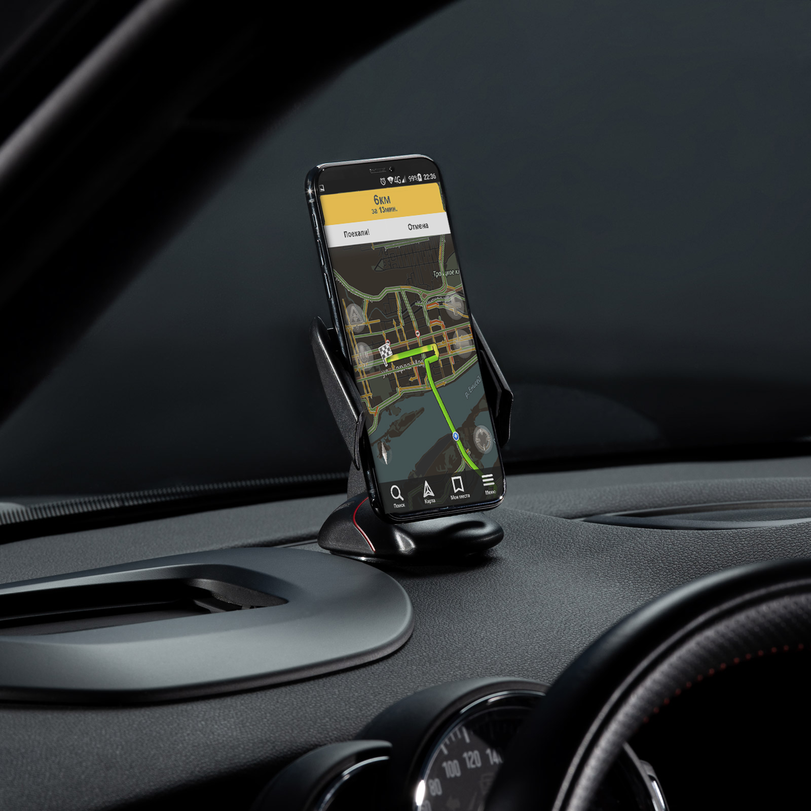 - Надежность — изделие прочно фиксируется на приборной панели с помощью вакуумной присоски, что исключает риск падения телефона.