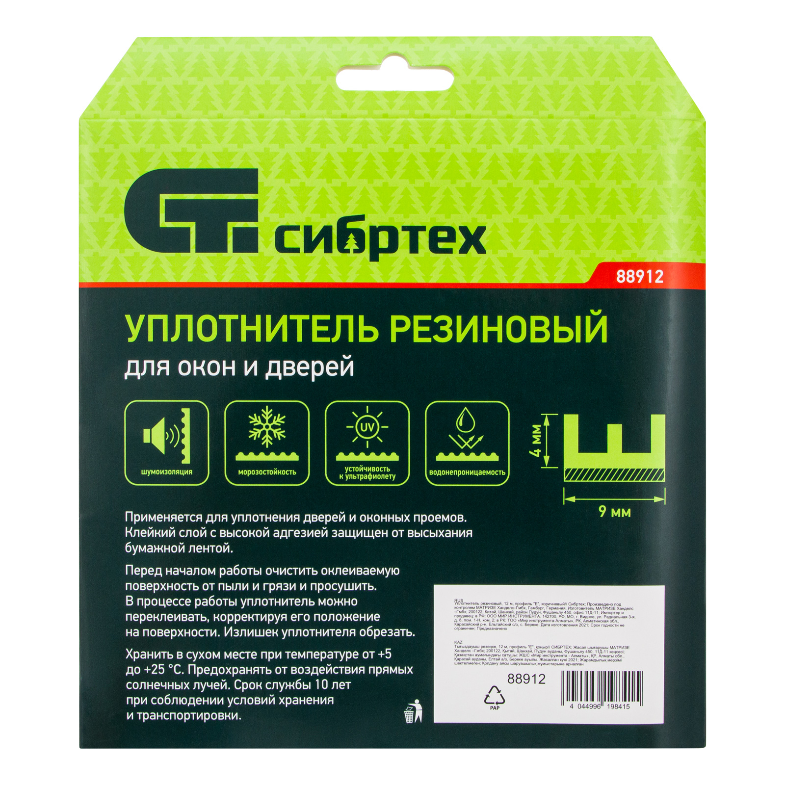 Коричневый резиновый уплотнитель Сибртех 88912 длиной 12 м, с профилем «E», предназначен для герметизации и уплотнения оконных и дверных блоков с целью предотвращения сквозняков и вибраций, защиты от влаги и пыли, создания эффективной тепло- и звукоизоляции. Клеевой слой обеспечивает высокую адгезию и надежную фиксацию. Использование уплотнителя позволяет значительно снизить энергетические и экономические затраты. Лента с E-профилем 9 х 4 мм подойдет для щелей размером 2-3,5 мм.