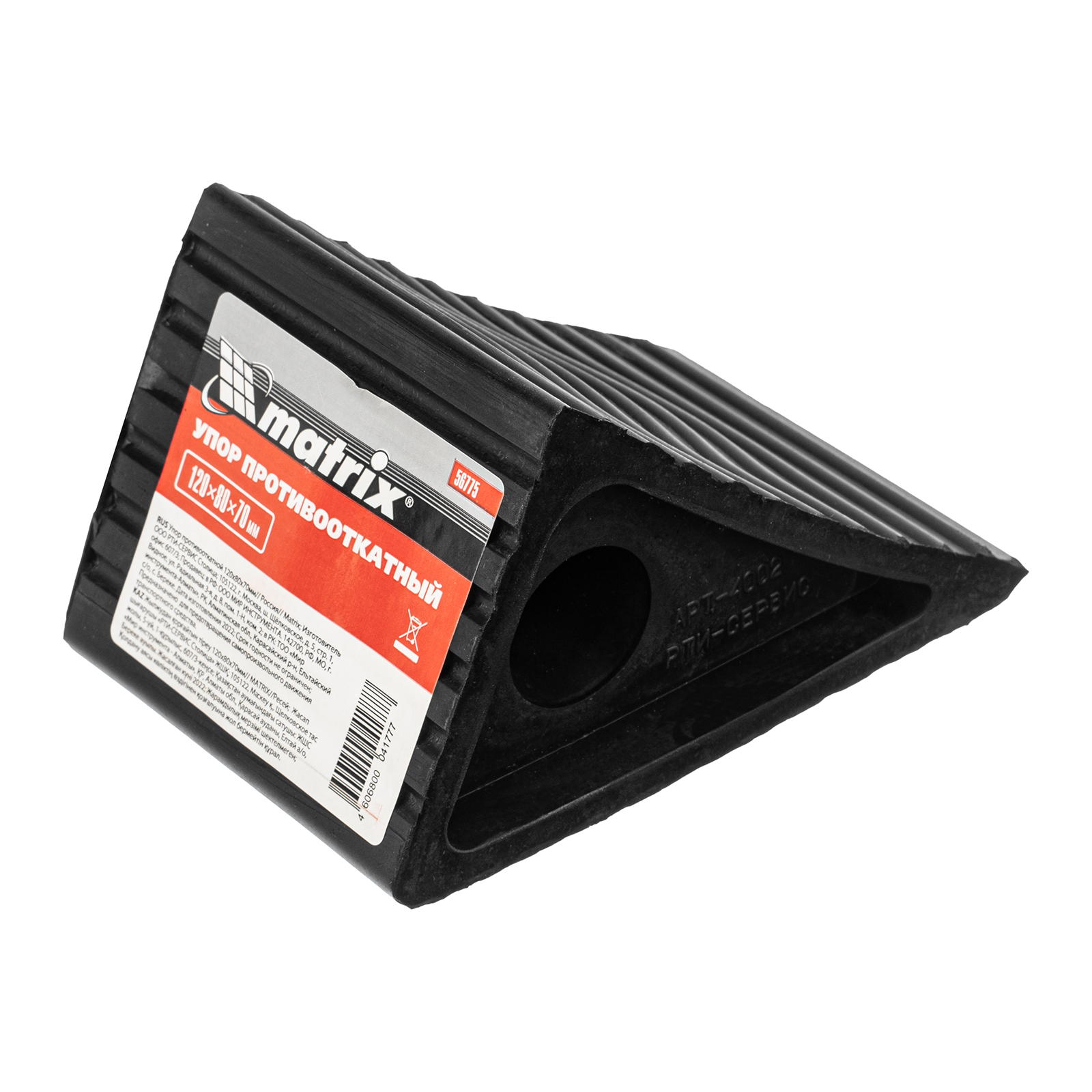 Противооткатный упор Matrix 56775 размером 120 х 80 х 70 мм не дает легковому автомобилю или прицепу скатываться при остановке на наклонной или неровной поверхности. Упор, или башмак, необходим также в случае подъема автомобиля на домкрате для ремонта или замены колеса. Пригодится в дороге, также будет полезен в гараже и на станции СТО.