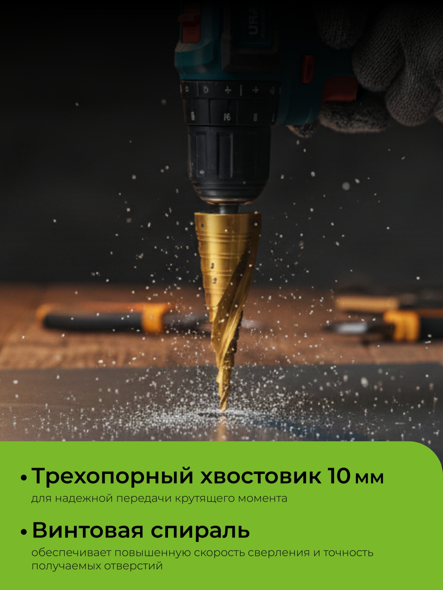 - Трехопорный хвостовик для предотвращения проскальзывания в патроне и передаче максимального режущего усилия