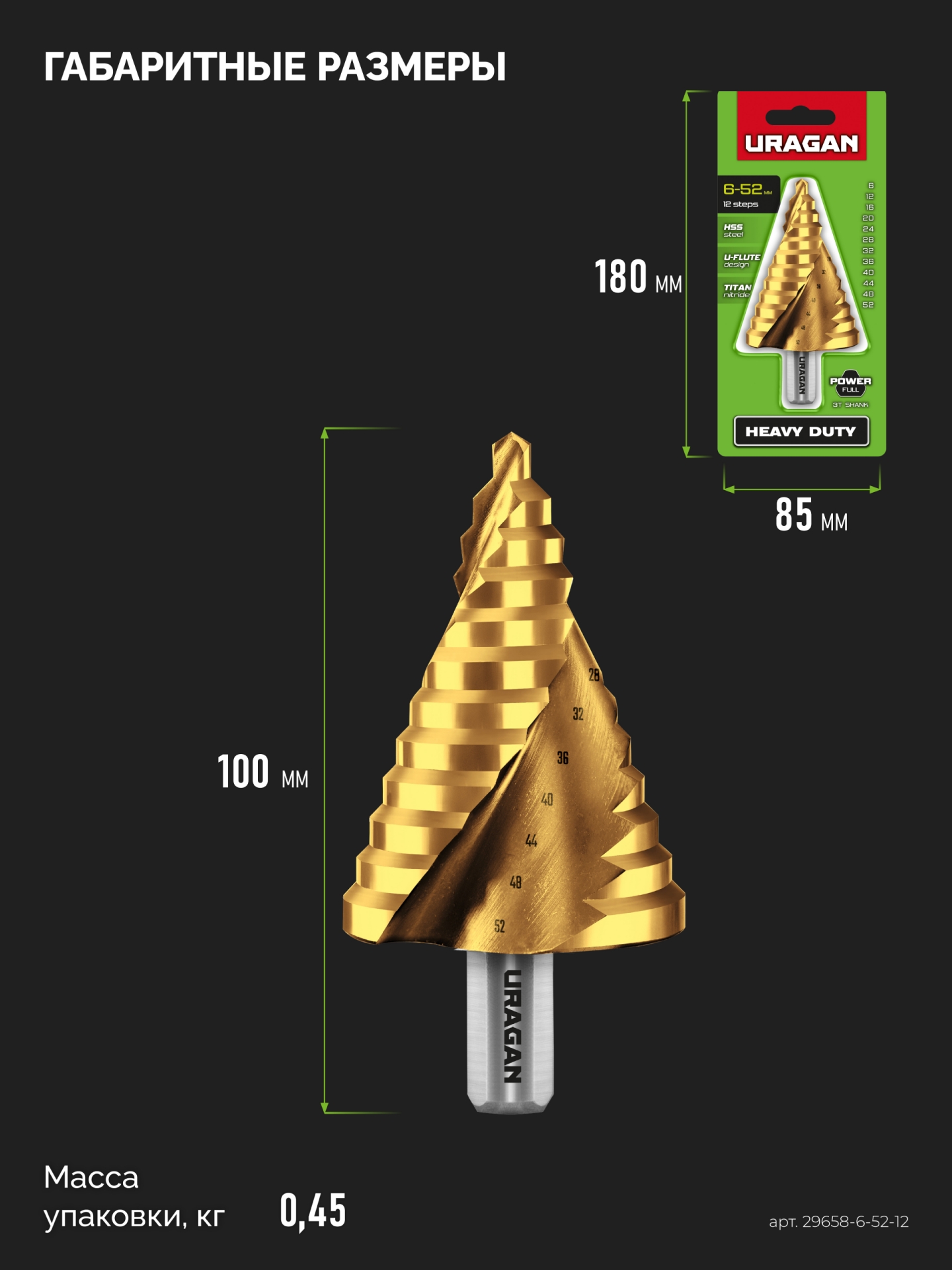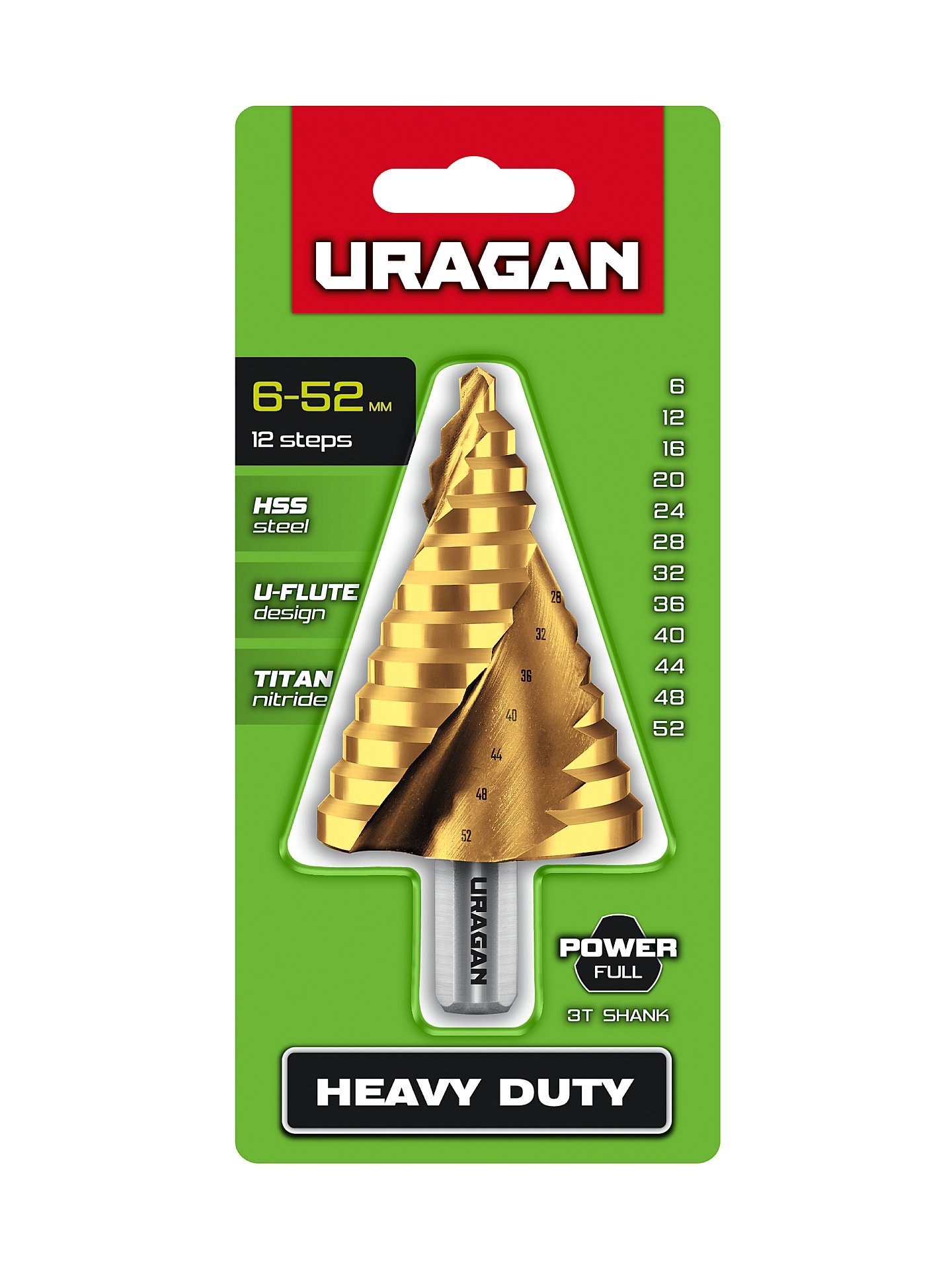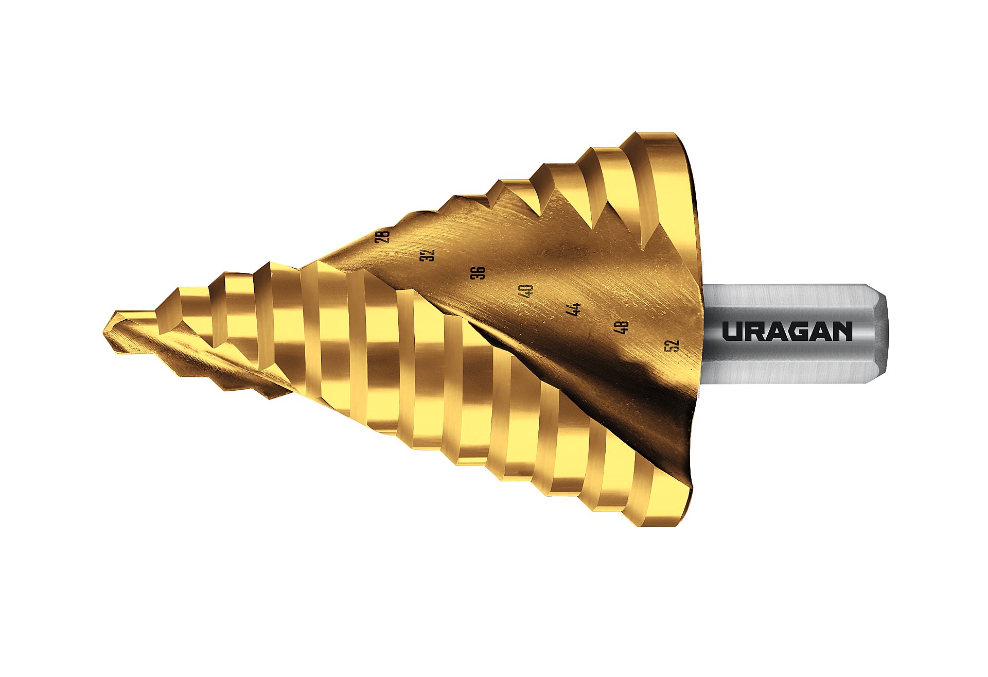 URAGAN 6-52мм, 12 ступеней, винтовая спираль, сверло ступенчатое(29658-6-52-12)