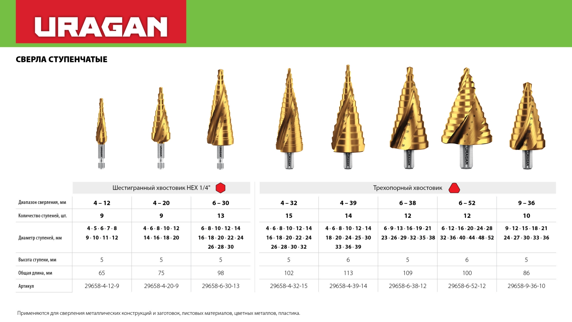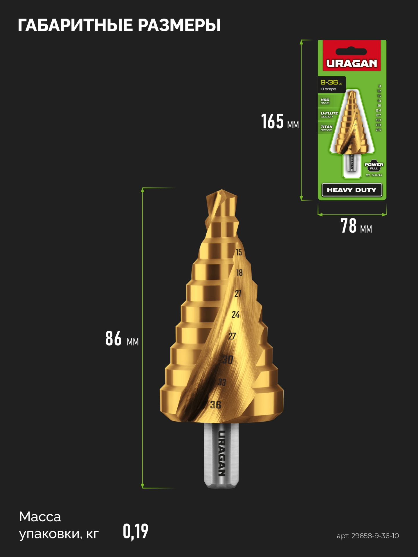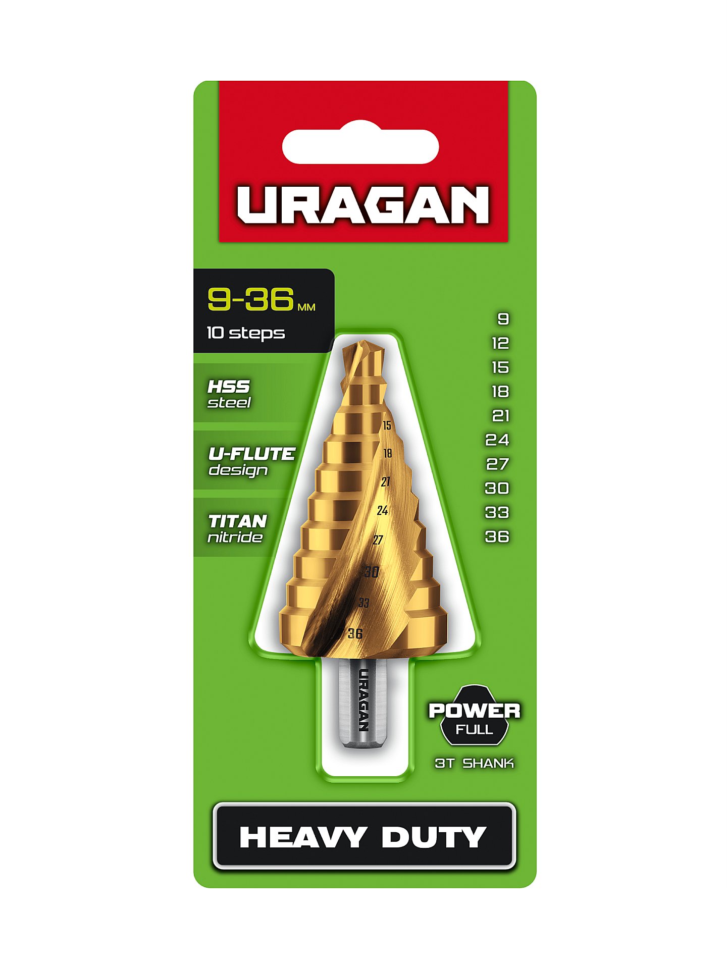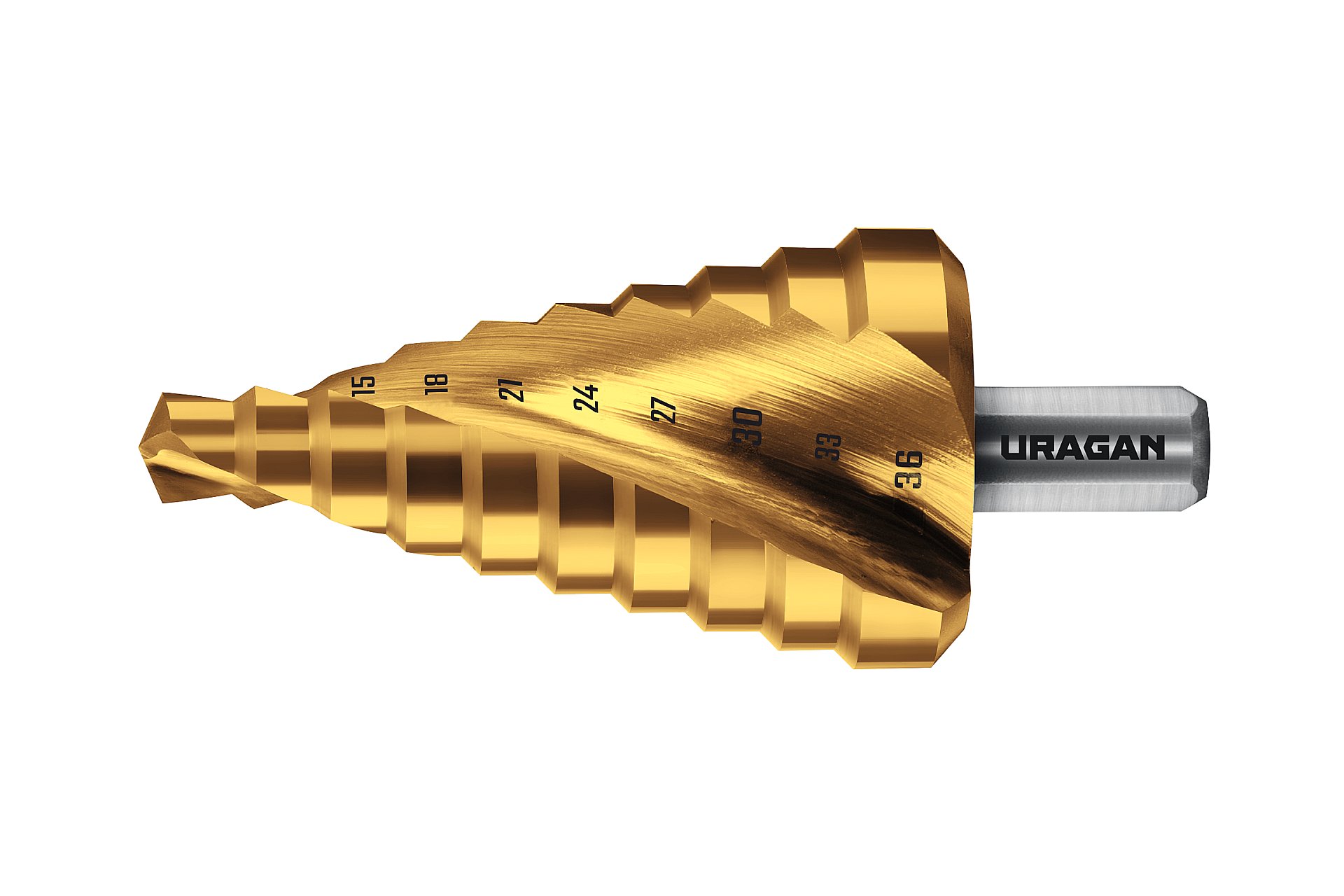 URAGAN 9-36мм, 10 ступеней, винтовая спираль, сверло ступенчатое (29658-9-36-10)