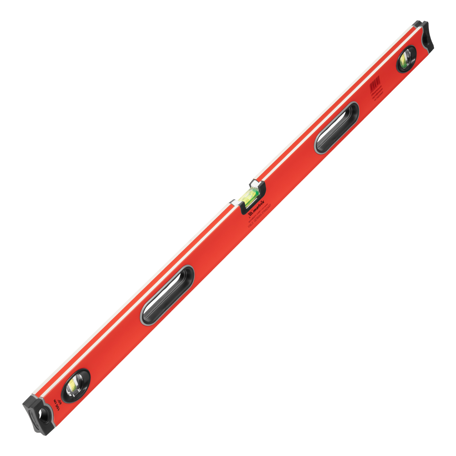<p>Алюминиевый уровень Matrix 34308 длиной 1000 мм, с 3 глазками, ударопрочными заглушками и двухкомпонентными ручками, повышает точность работы, т. к. позволяет обнаружить отклонения от вертикали, горизонтали и угла 45°. Используется для монтажа конструкций, укладки покрытий, облицовки поверхностей и т. д., подходит для профессионального и бытового применения.</p><h2>Преимущества</h2><ul><li>Прочная и долговечная конструкция — инструмент изготовлен из алюминиевого профиля.</li><li>Точность 0,5 мм/м — рабочая поверхность фрезерована.</li><li>Надежный хват — производитель предусмотрел отверстия с подпальцевыми выемками.</li></ul><p>Для определения отклонения вертикали 90° необходимо использовать пузырьковую ампулу только в верхнем положении уровня. Только базовая поверхность (противоположная ампуле 180°) является рабочей.</p>