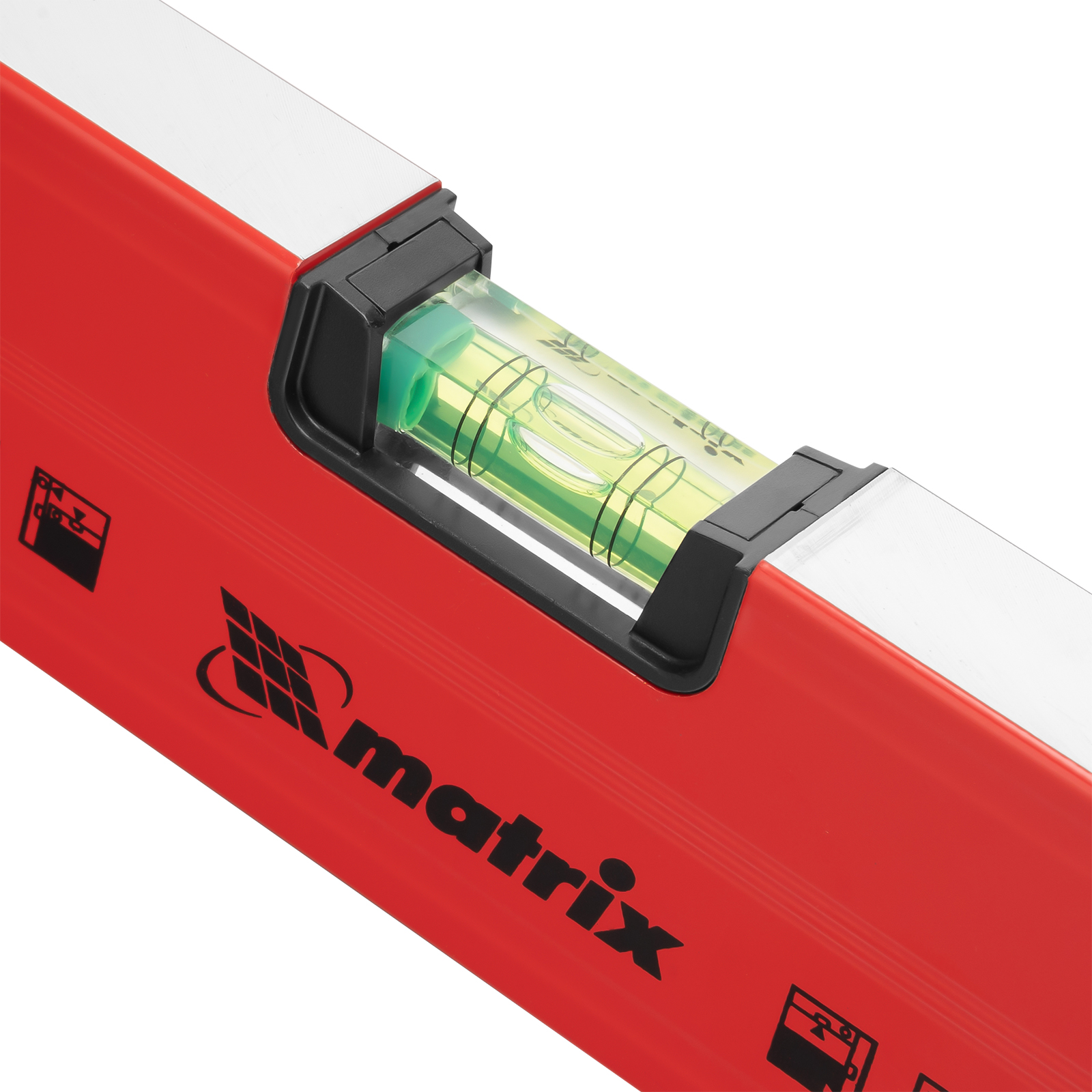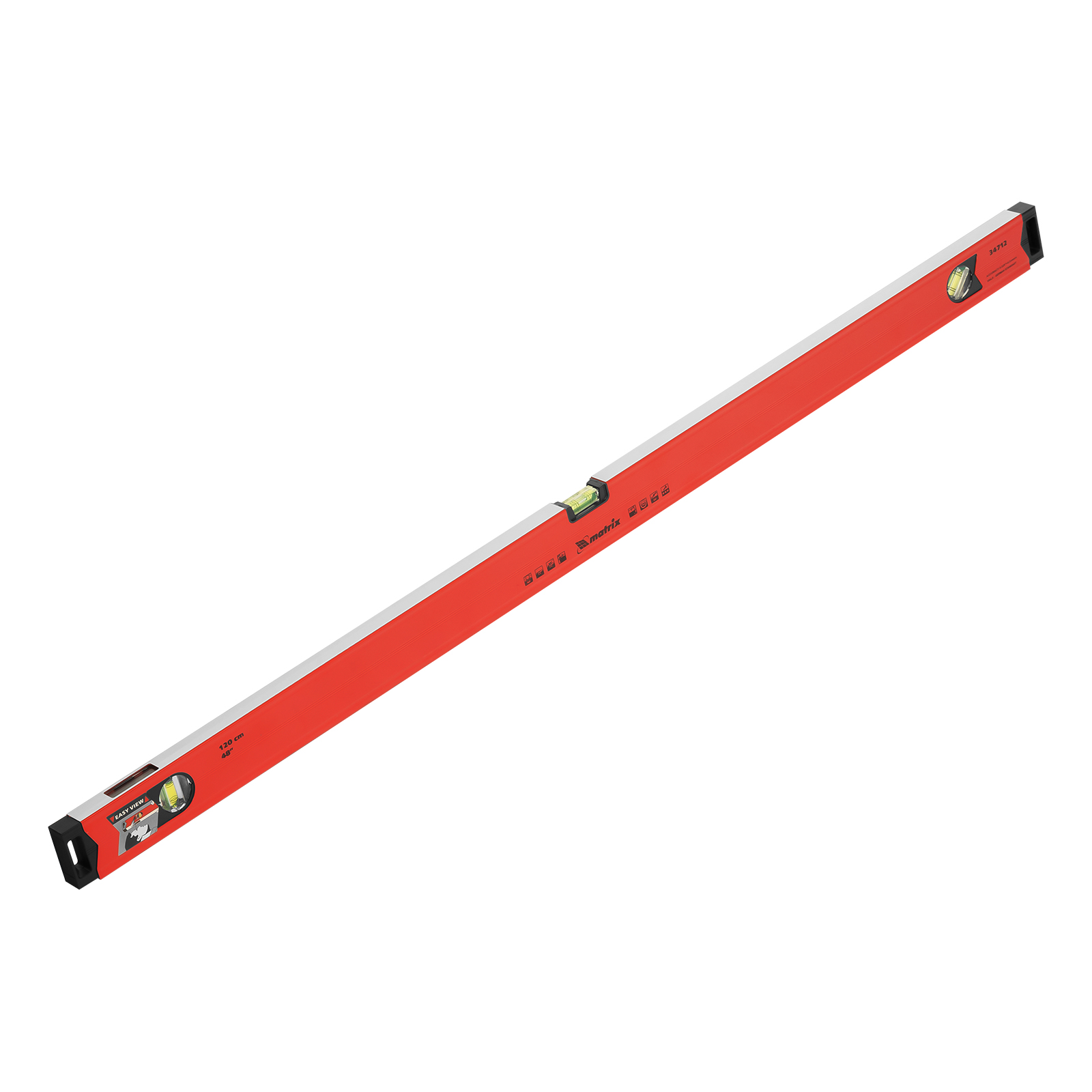 Уровень алюминиевый магнитный Matrix 34712 усиленной конструкции, длиной 1200 мм, с фрезерованной рабочей поверхностью, оснащен 3 глазками и одним зеркальным отражателем. Позволяет выявить отклонения от вертикали, горизонтали и угла 45°. Встроенный зеркальный глазок облегчает считывание показаний.