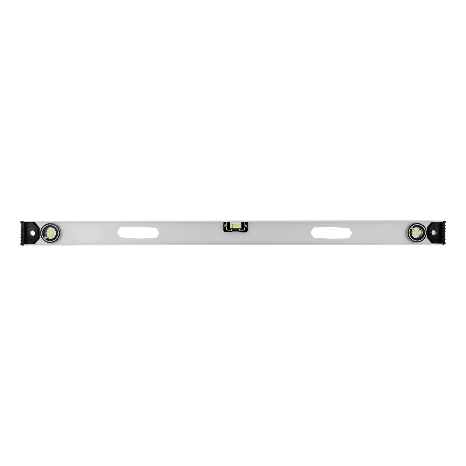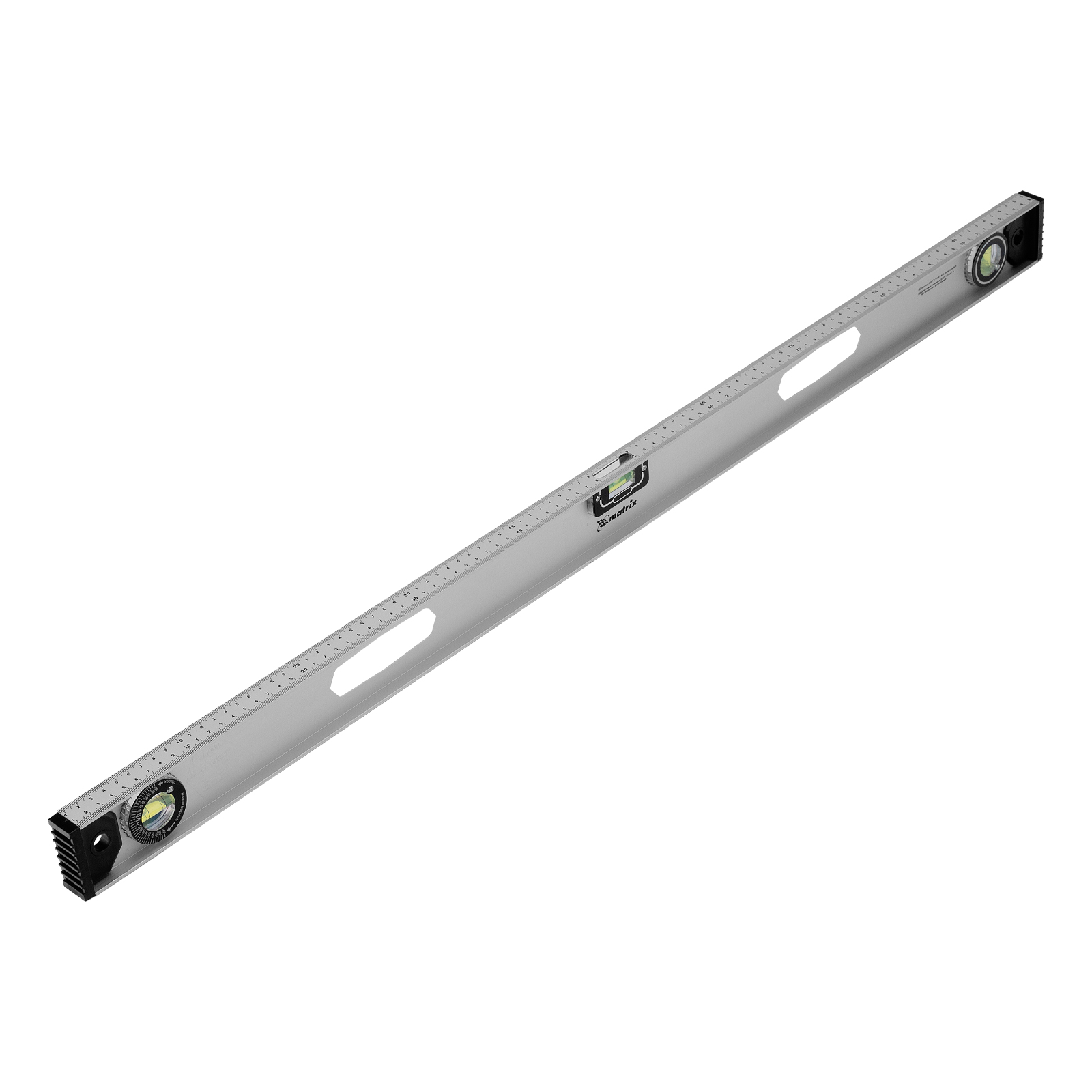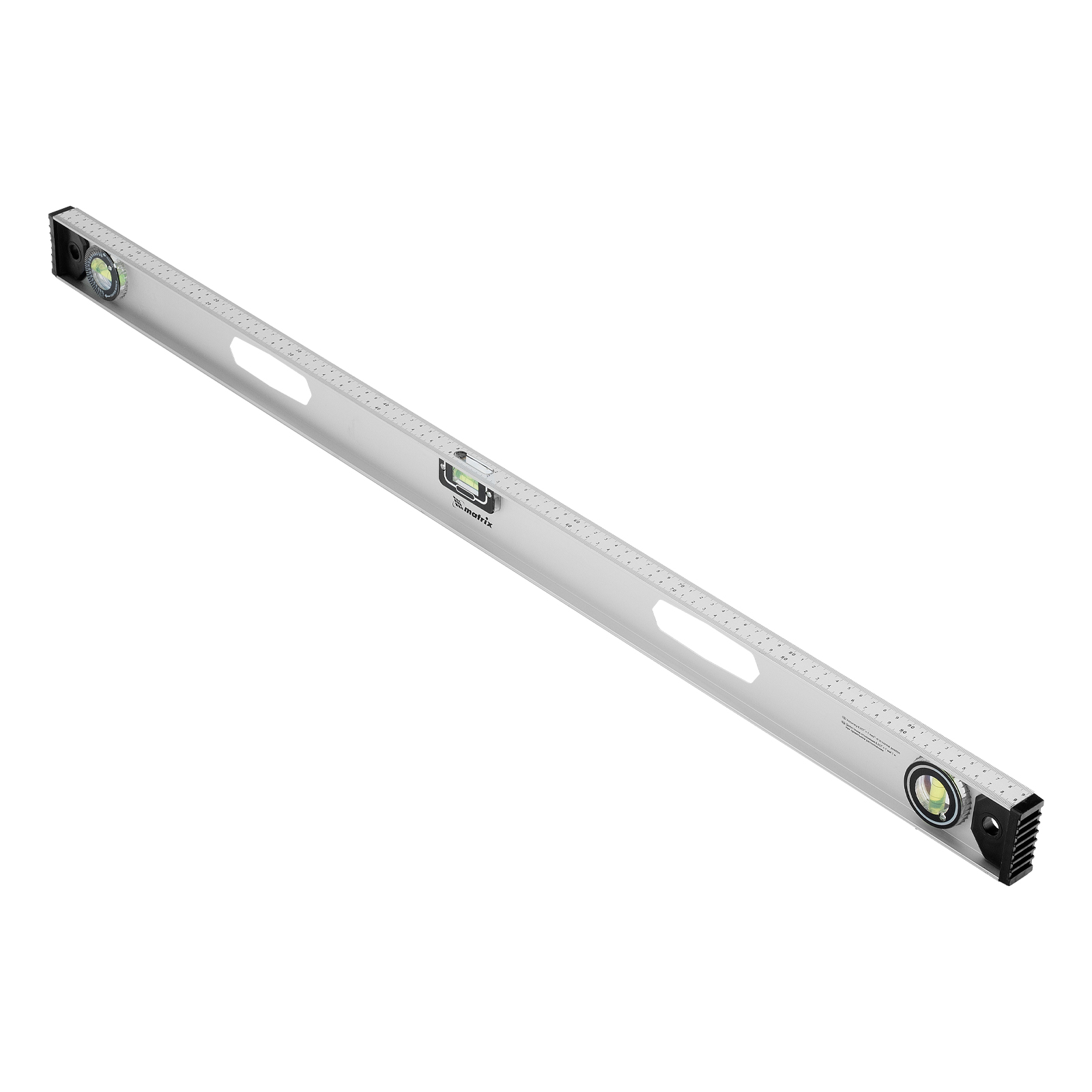 Алюминиевый уровень Matrix «Рельс» 34029 длиной 1000 мм имеет 3 глазка: 2 для проверки отклонений от заданной вертикали и горизонтали и 1 поворотный для проверки наклонных поверхностей.