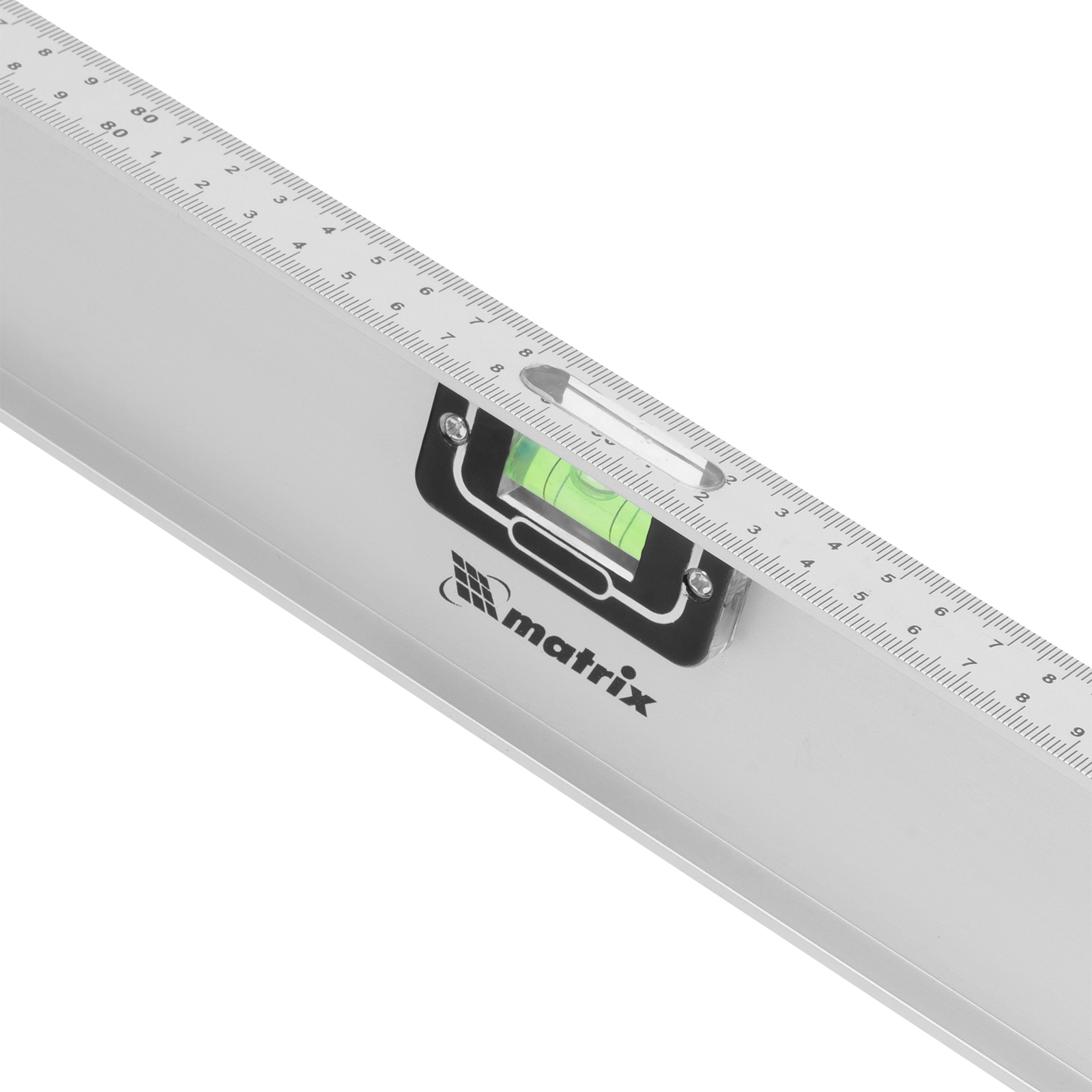 Алюминиевый уровень Matrix «Рельс» 34038 длиной 1800 мм имеет 3 глазка: 2 для проверки отклонений от заданной вертикали и горизонтали и 1 поворотный для проверки наклонных поверхностей.