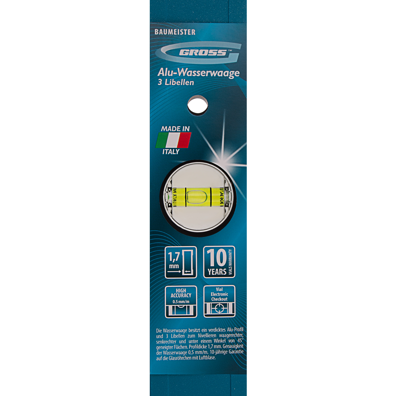 Качественное исполнение — уровень изготовлен в Италии на высокотехнологичном производстве, погрешность измерений составляет всего 0,5 мм/м.