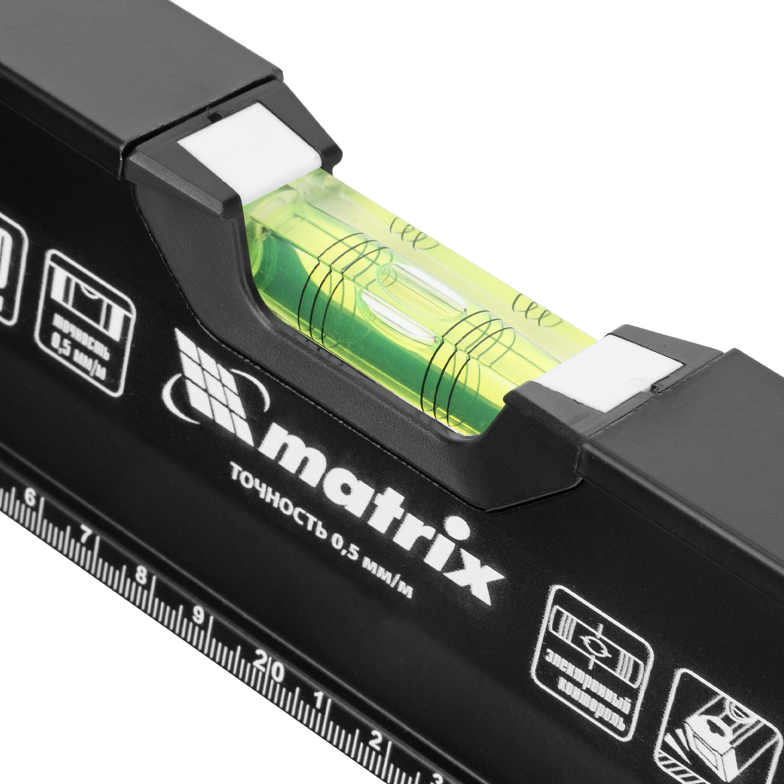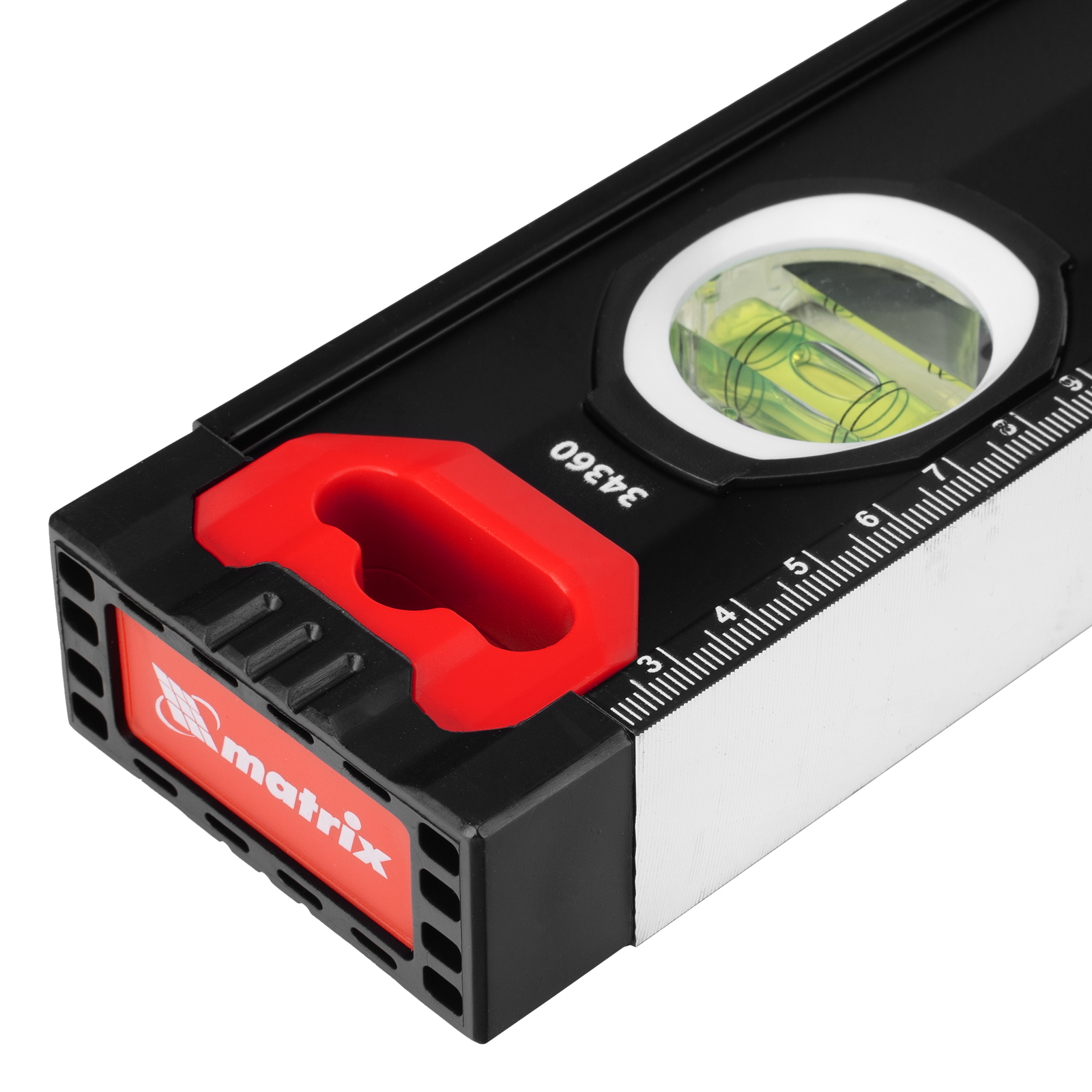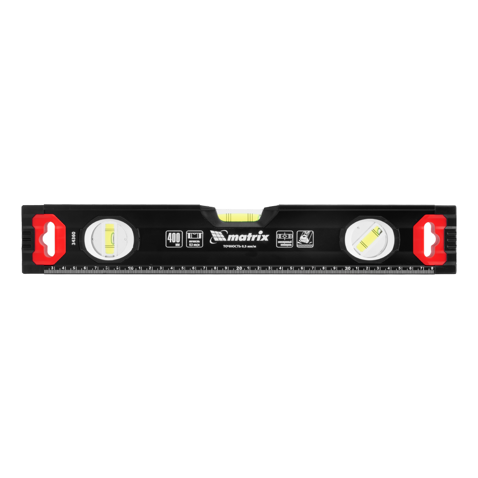 Уровень алюминиевый усиленный Matrix 34360 длиной 400 мм, фрезерованный, с 3 глазками, используется для проверки точности горизонтальных и вертикальных поверхностей и угла 45°. Инструмент повышает качество монтажных, отделочных и других работ, незаменим на строительной площадке.