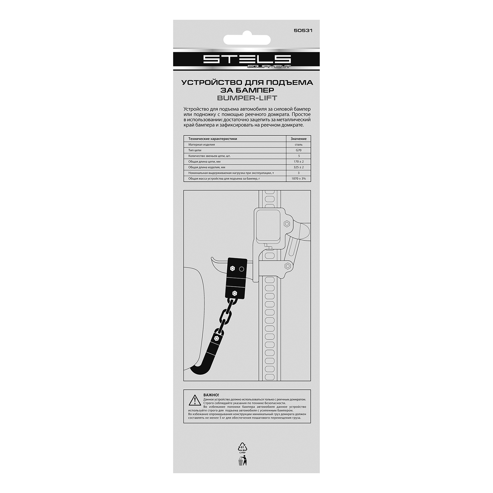 Устройство для подъема за бампер Stels Bumper-Lift 50531 с цепью из 5 звеньев позволяет быстро и аккуратно поднять автомобиль, если высоты подхвата недостаточно для установки реечного домкрата. Поможет освободить засевшую в грязи или кювете автомашину. Пригодится автовладельцам в дальних поездках.