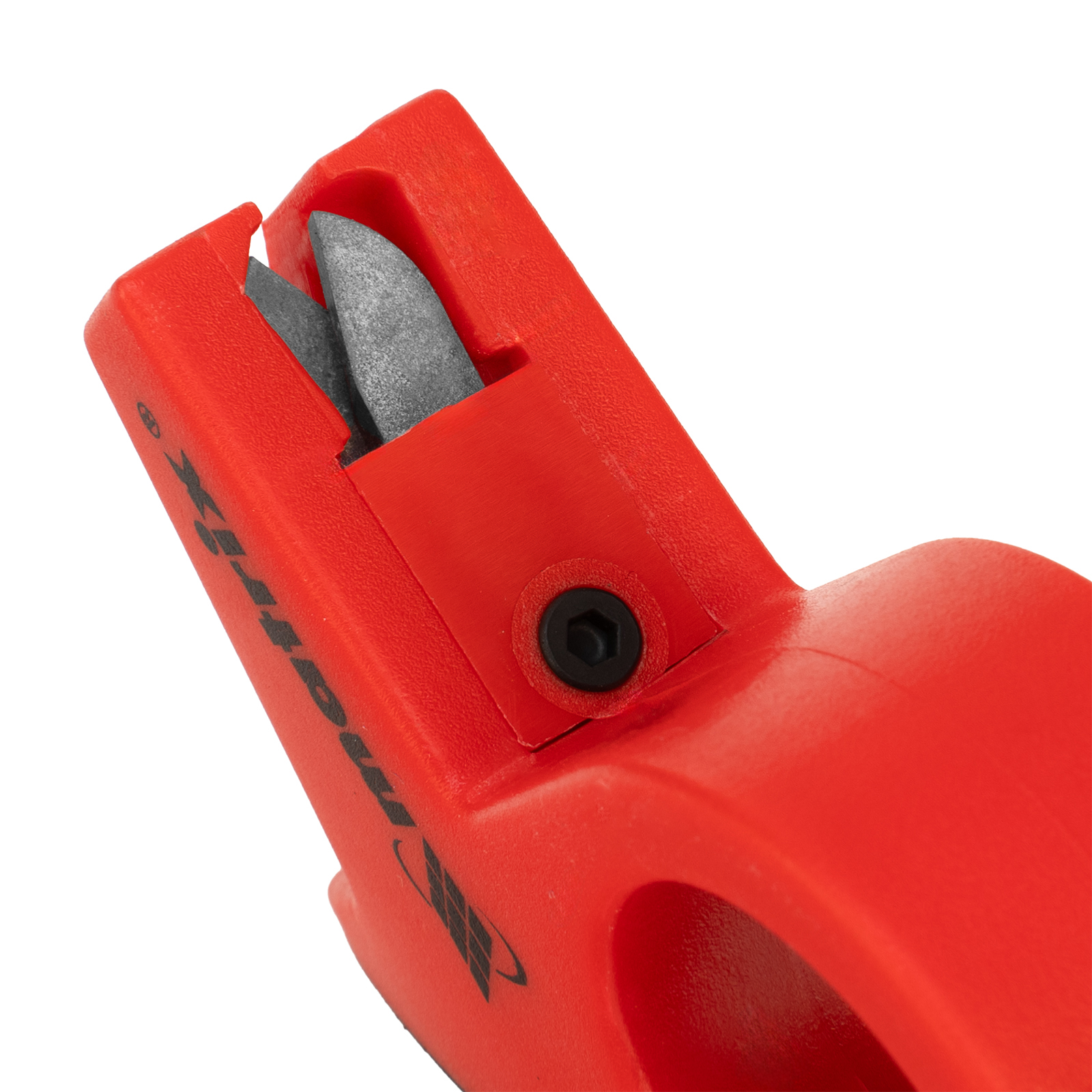 Универсальное устройство для заточки Matrix 79101, малое, служит для восстановления остроты ножей, а также кос, тесаков, резаков и других режущих инструментов. У точилки имеется защитная кулиса, поэтому она безопасна в эксплуатации. Устройством могут пользоваться как правши, так и левши. Способ применения прост — достаточно 1-2 раза провести точилкой по режущей кромке. Приспособление рекомендовано для использования в быту.