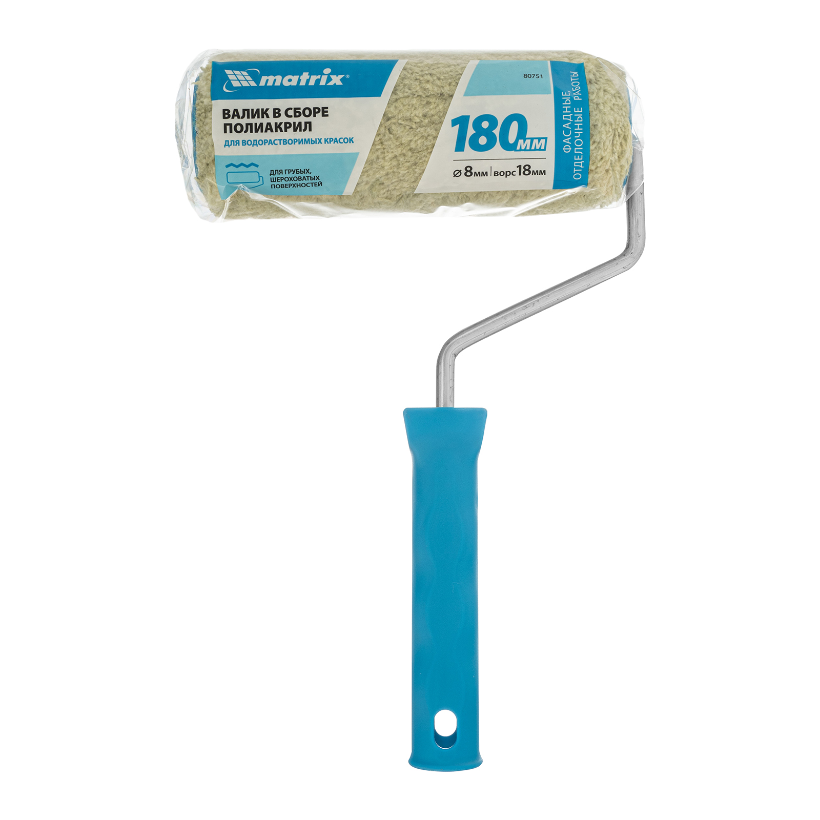 Синтетический валик для фасадных работ Matrix 80751 с ворсом 18 мм из полиакрила, бюгелем 8 мм, шириной ролика 180 мм и диаметром 48 мм, предназначен для малярных работ по штукатурке, кирпичу, бетону, гофрированному металлу, внешним стенам зданий и другим текстурным поверхностям. Шубка с длинным ворсом 18 мм позволяет качественно окрашивать грубые и необработанные участки без разбрызгивания ЛКМ. Валик можно использовать с любыми красками, т.к. он выполнен из полиакрила, устойчивого к растворителям.