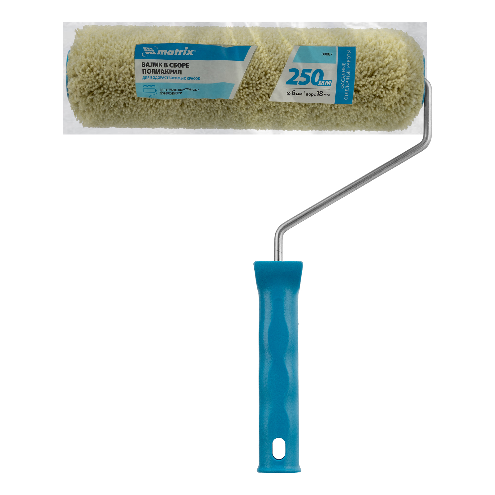 Синтетический валик для фасадных работ Matrix 80887 с ворсом 18 мм из полиакрила, бюгелем 6 мм, шириной ролика 250 мм и диаметром 36 мм, предназначен для малярных работ по штукатурке, кирпичу, бетону, гофрированному металлу, внешним стенам зданий и другим текстурным поверхностям. Шубка с длинным ворсом 18 мм позволяет качественно окрашивать грубые и необработанные участки без разбрызгивания ЛКМ. Валик можно использовать с любыми красками, т.к. он выполнен из полиакрила, устойчивого к растворителям.