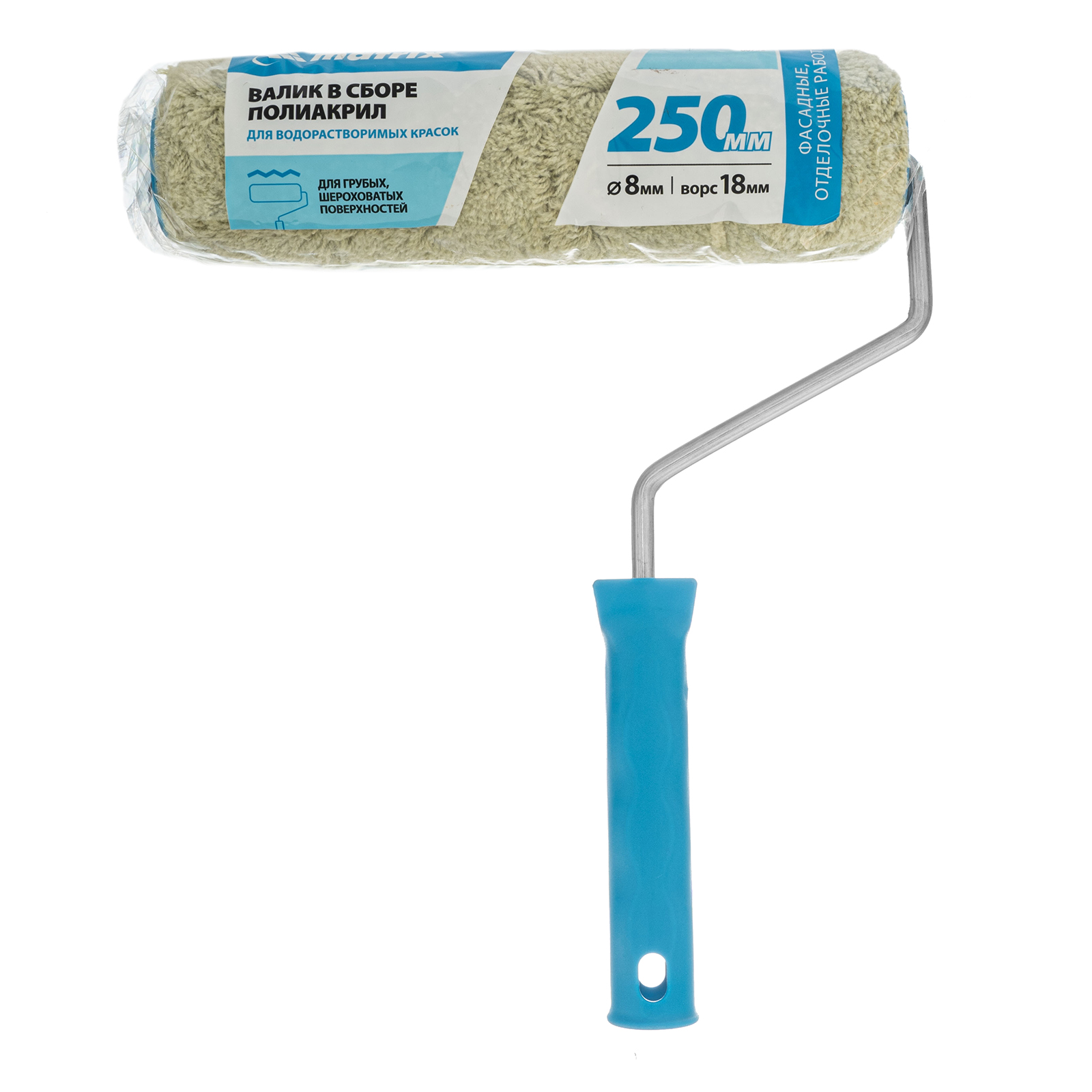 Синтетический валик для фасадных работ Matrix 80752 с ворсом 18 мм из полиакрила, бюгелем 8 мм, шириной ролика 250 мм и диаметром 48 мм, предназначен для малярных работ по штукатурке, кирпичу, бетону, гофрированному металлу, внешним стенам зданий и другим текстурным поверхностям. Шубка с длинным ворсом 18 мм позволяет качественно окрашивать грубые и необработанные участки без разбрызгивания ЛКМ. Валик можно использовать с любыми красками, т.к. он выполнен из полиакрила, устойчивого к растворителям.