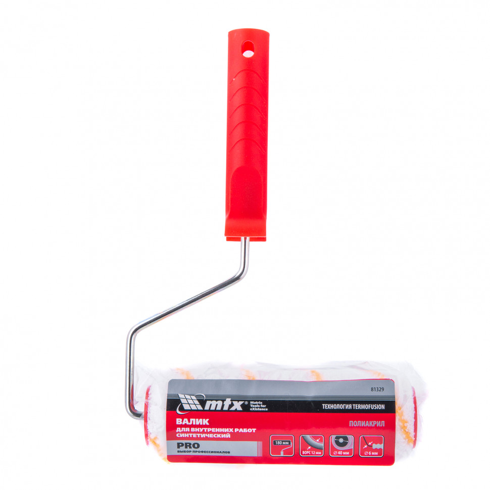 Синтетический валик для внутренних работ MTX PRO 81329 с ворсом из полиакрила 12 мм, шириной ролика 180 мм, диаметром 40 мм, ручкой 6 мм, предназначен для окрашивания больших площадей. Он позволяет окрашивать среднегладкие и шероховатые участки — стены, потолки, деревянные поверхности.