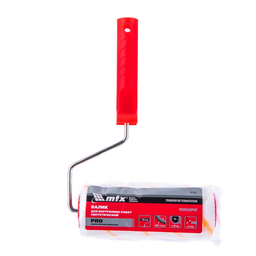 Синтетический валик для внутренних работ MTX PRO 81301 с ворсом из полиакрила 12 мм, шириной ролика 180 мм, диаметром 48 мм, ручкой 6 мм, предназначен для окрашивания больших площадей. Он позволяет окрашивать среднегладкие и шероховатые участки — стены, потолки, деревянные поверхности.