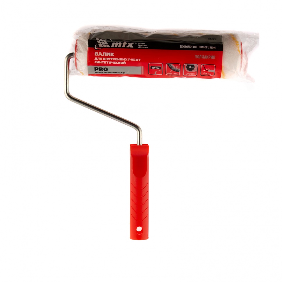 Синтетический валик для внутренних работ MTX PRO 81351 с ворсом из полиакрила 12 мм, шириной ролика 250 мм, диаметром 48 мм, ручкой 8 мм, предназначен для окрашивания больших площадей. Он позволяет окрашивать среднегладкие и шероховатые участки — стены, потолки, деревянные поверхности.