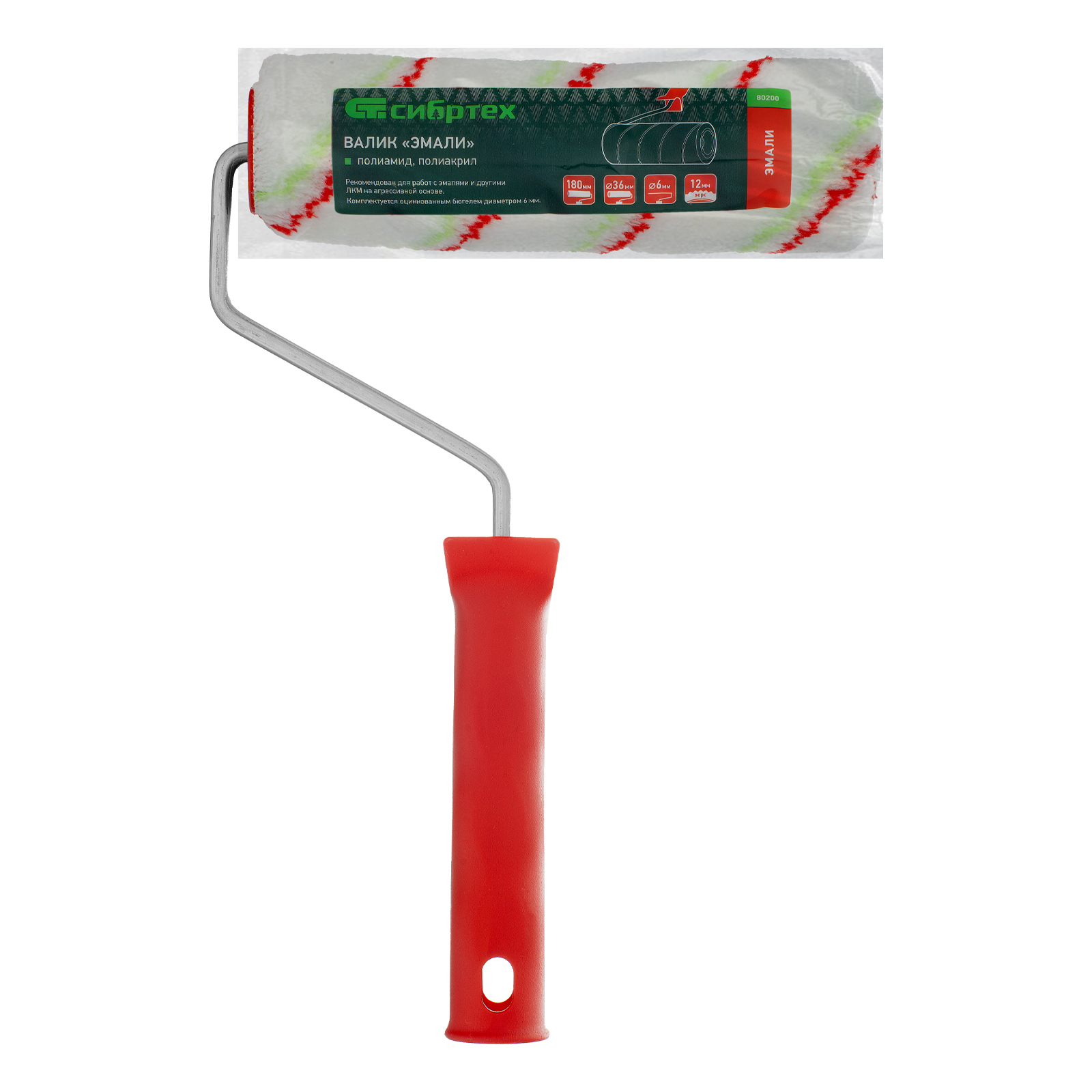Валик Сибртех «Эмали» 80200 из полиамида и полиакрила, с ручкой 6 мм, роликом 180 х 36 мм, длиной ворса 12 мм, предназначен для проведения малярных работ. Валик повышенной износостойкости можно использовать для нанесения любых ЛКМ, в том числе содержащих агрессивные вещества, на поверхности с различной фактурой. Рекомендован для работ с эмалями.